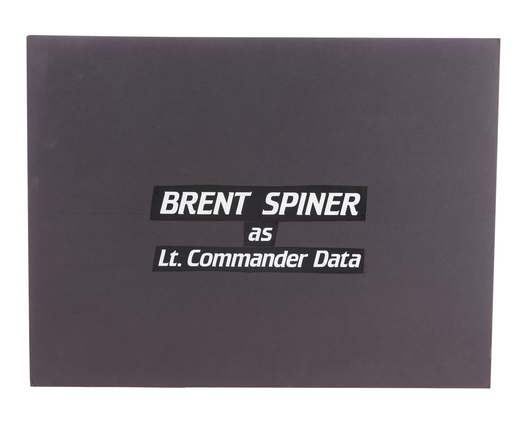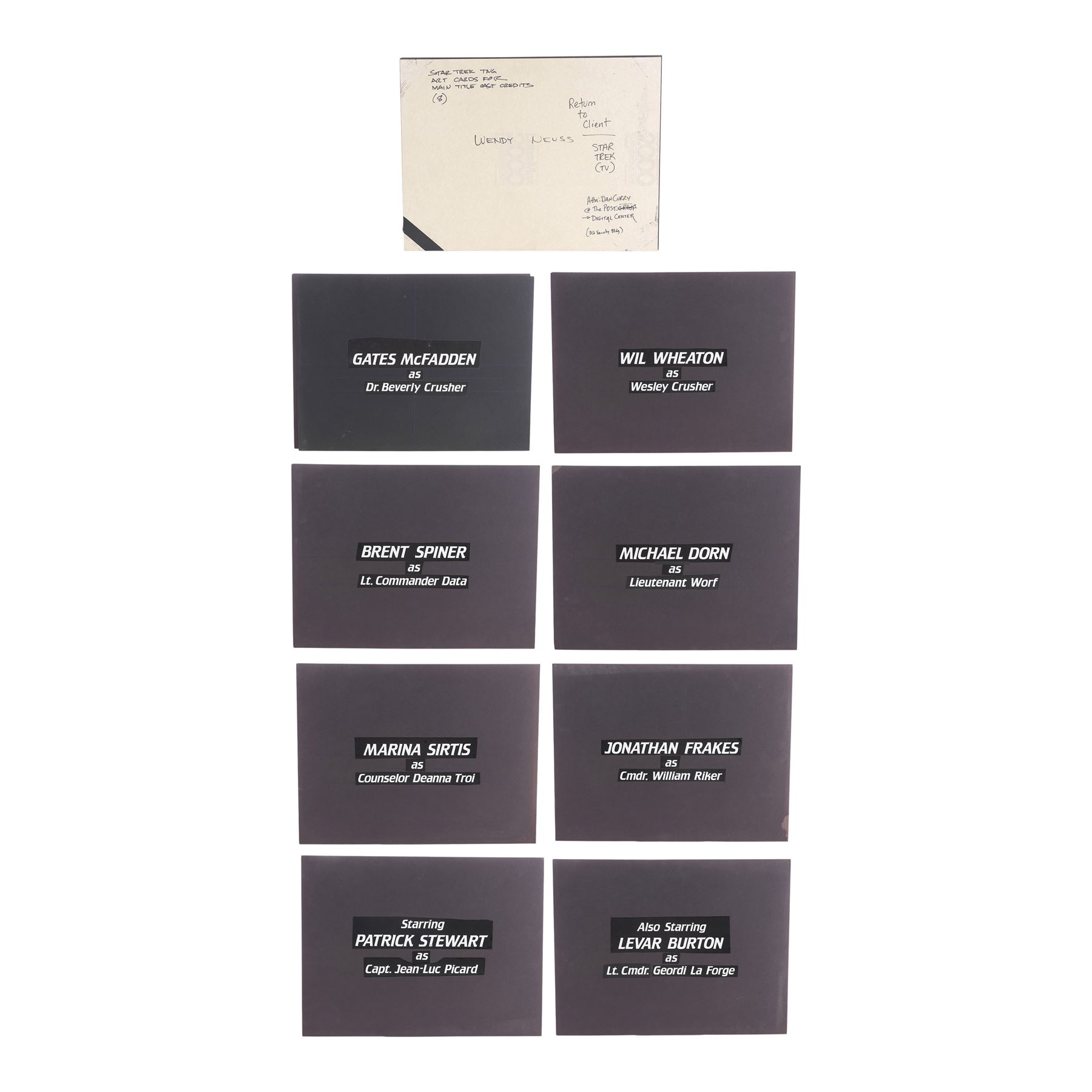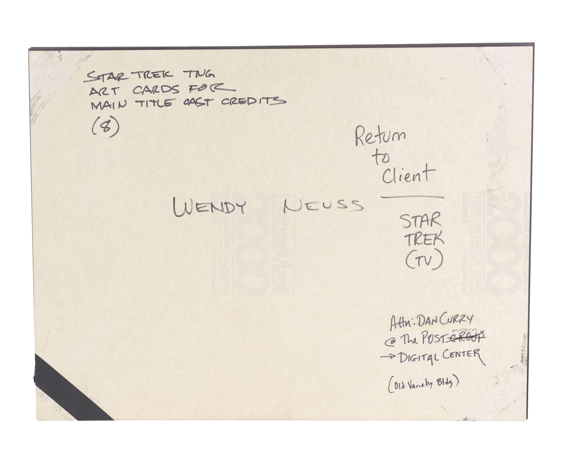 This lot, which comes from the collection of celebrated Star Trek franchise artists and advisors Michael and Denise Okuda, consists of eight title cards made of cut-out photostat prints pasted onto black art cards. The feature credits for Patrick Stewart, Jonathan Frakes, LeVar Burton, Michael Dorn, Gates McFadden, Marina Sirtis, Brent Spiner, and Wil Wheaton. Also included is a cover with hand-written labeling including "Star Trek TNG Art Cards for Main Title Cast Credits (8)." The cards exhibit some small tears and fading from age, with edges lifting on the pasted titles. Dimensions: (each) 20.25" x 15" x 0.25" (51.5 cm x 38.25 cm x 1.5 cm)Though their long and celebrated careers in the Star Trek world began in features, Michael and Denise Okuda established themselves as franchise legends while working on Star Trek: The Next Generation. Michael became art supervisor on TNG, while Denise came on as a scenic artist during Deep Space Nine, roles they would continue to perform through Voyager, Enterprise, and the Next Generation films. Married in 1993, the Okudas are known as the driving forces behind the development of many of the now-iconic 24th-century technologies seen throughout the series, including the famous "Okudagrams" they created for the LCARS (Library Computer Access and Retrieval System) interfaces . Propstore is proud to present a selection of key memorabilia from the personal collection of one of the franchise's most important creative teams to the public for the first time.