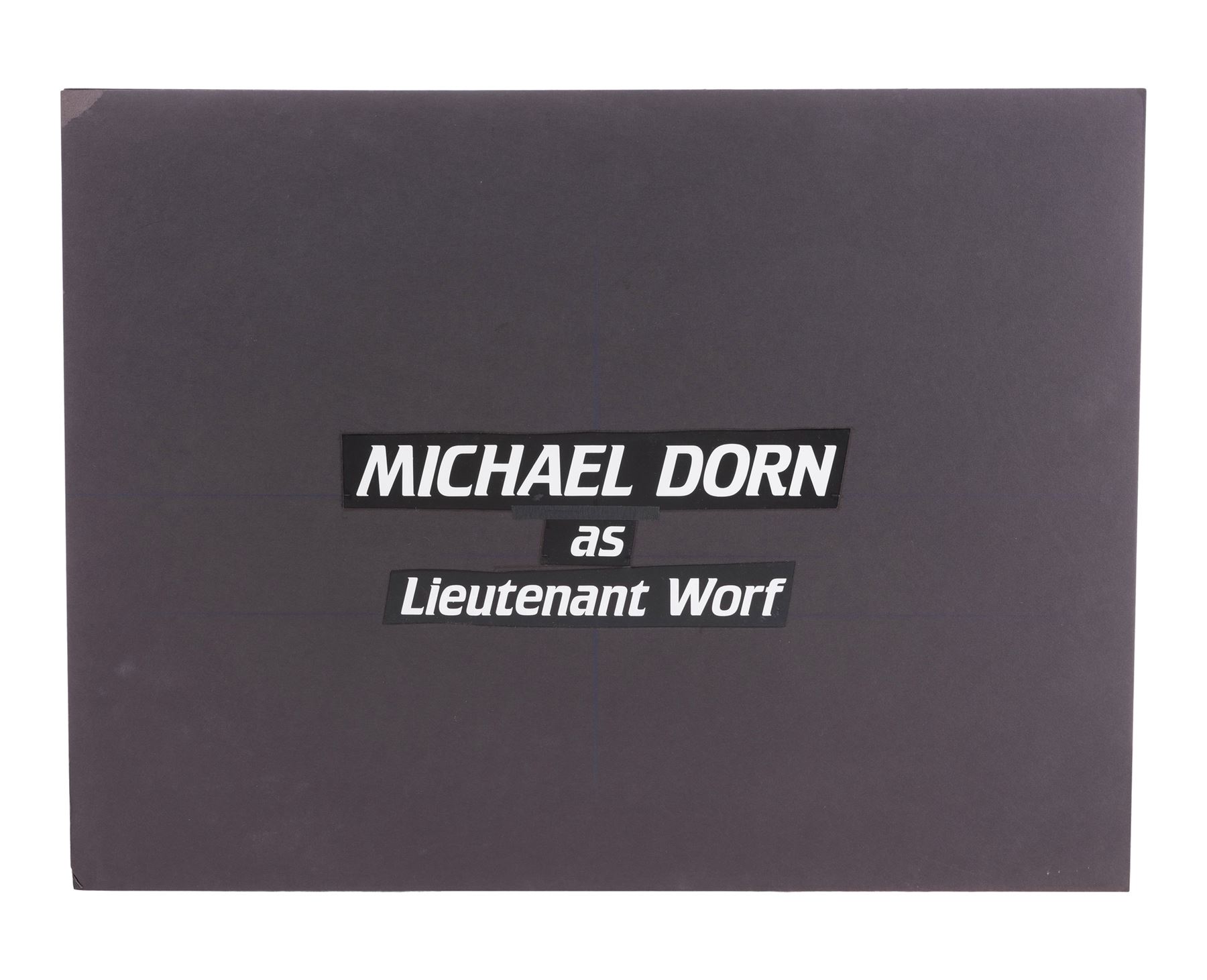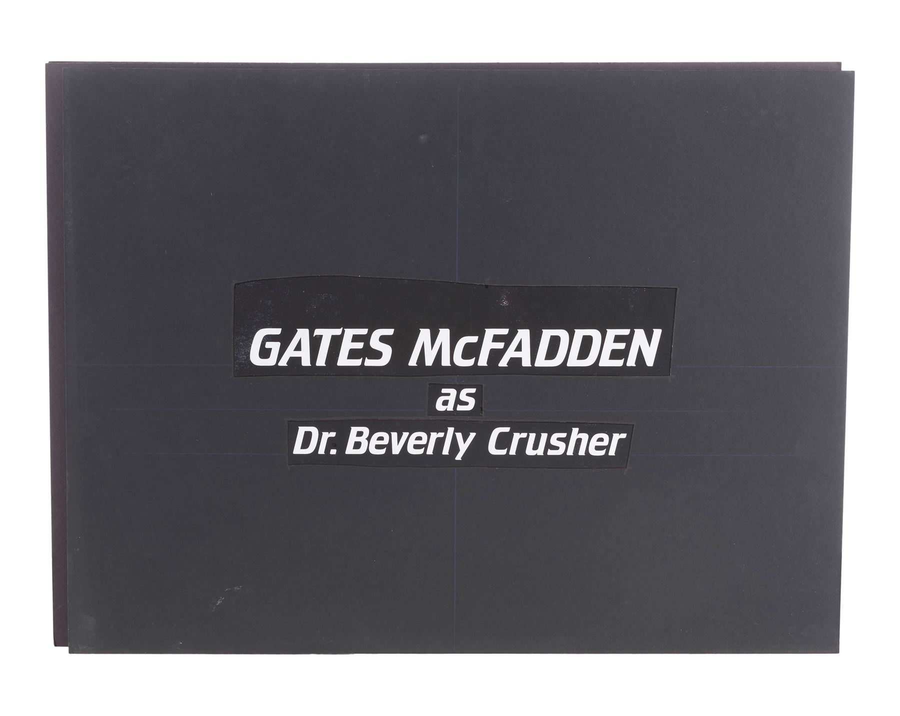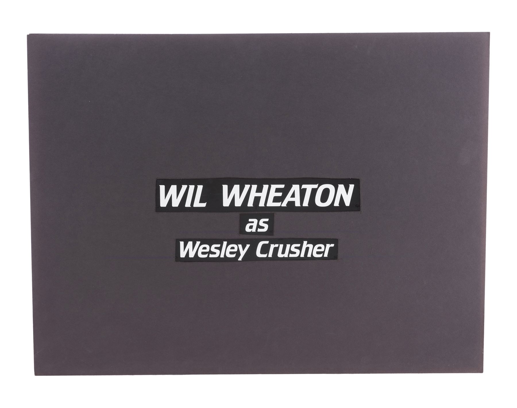 This lot, which comes from the collection of celebrated Star Trek franchise artists and advisors Michael and Denise Okuda, consists of eight title cards made of cut-out photostat prints pasted onto black art cards. The feature credits for Patrick Stewart, Jonathan Frakes, LeVar Burton, Michael Dorn, Gates McFadden, Marina Sirtis, Brent Spiner, and Wil Wheaton. Also included is a cover with hand-written labeling including "Star Trek TNG Art Cards for Main Title Cast Credits (8)." The cards exhibit some small tears and fading from age, with edges lifting on the pasted titles. Dimensions: (each) 20.25" x 15" x 0.25" (51.5 cm x 38.25 cm x 1.5 cm)Though their long and celebrated careers in the Star Trek world began in features, Michael and Denise Okuda established themselves as franchise legends while working on Star Trek: The Next Generation. Michael became art supervisor on TNG, while Denise came on as a scenic artist during Deep Space Nine, roles they would continue to perform through Voyager, Enterprise, and the Next Generation films. Married in 1993, the Okudas are known as the driving forces behind the development of many of the now-iconic 24th-century technologies seen throughout the series, including the famous "Okudagrams" they created for the LCARS (Library Computer Access and Retrieval System) interfaces . Propstore is proud to present a selection of key memorabilia from the personal collection of one of the franchise's most important creative teams to the public for the first time.