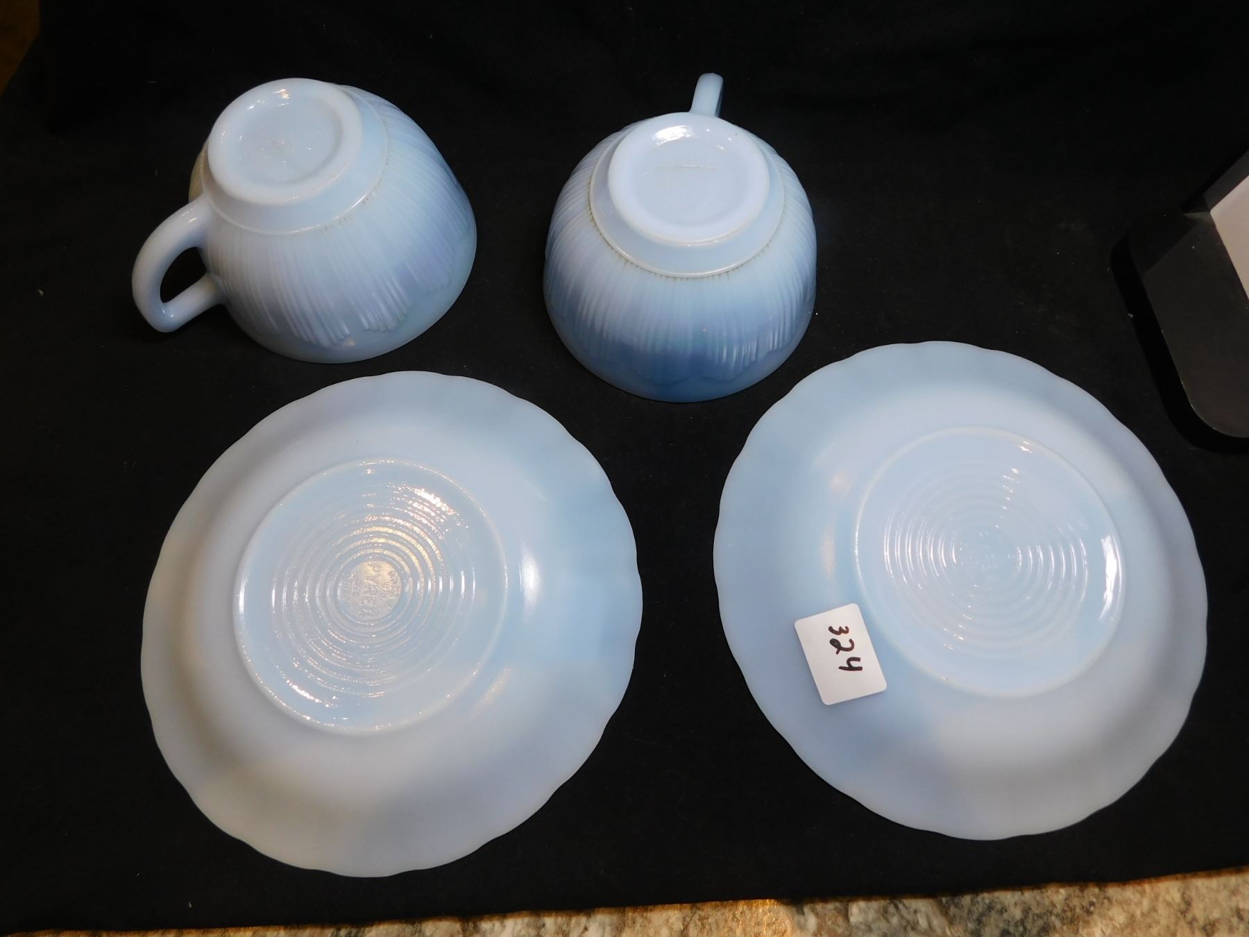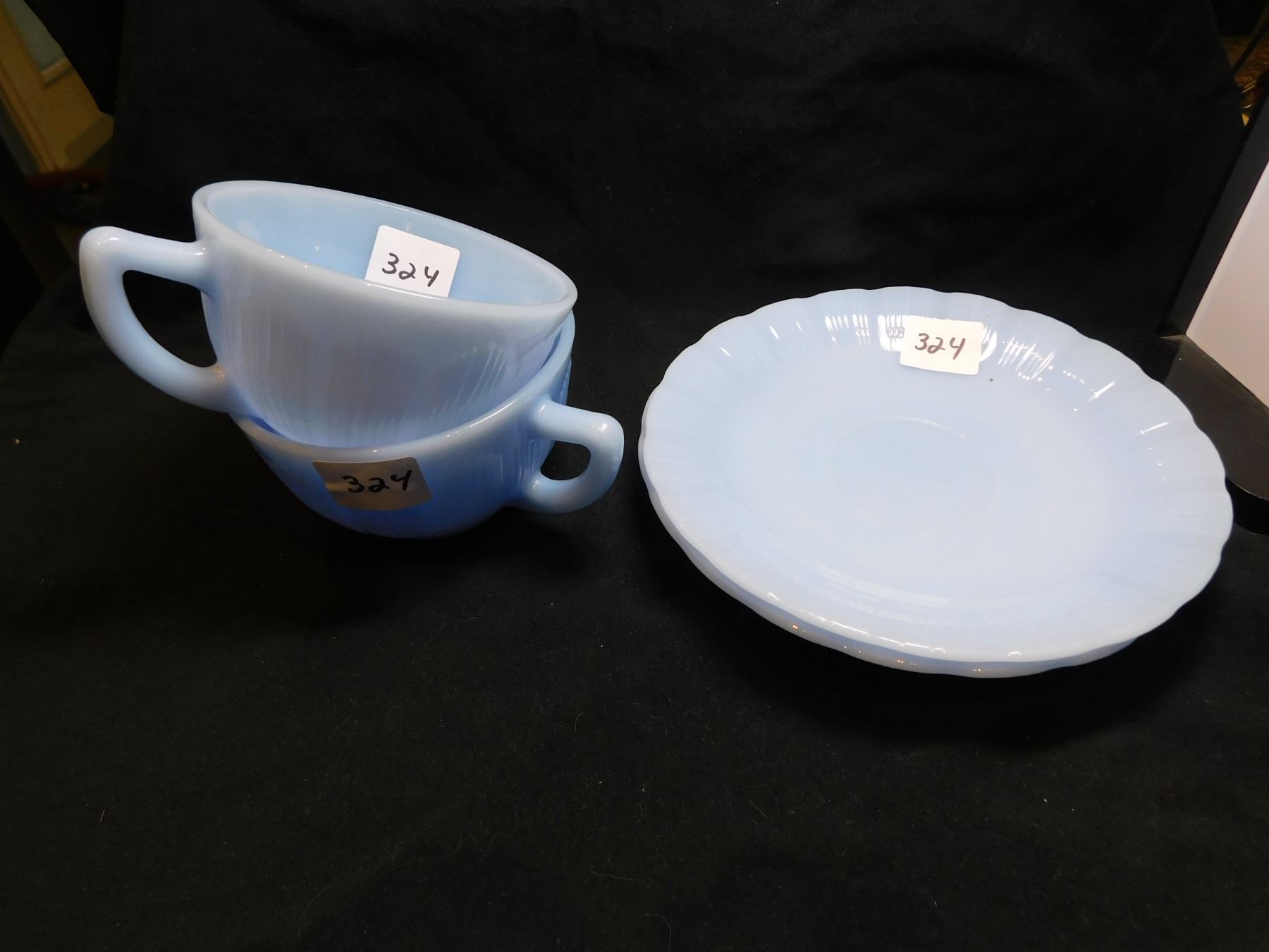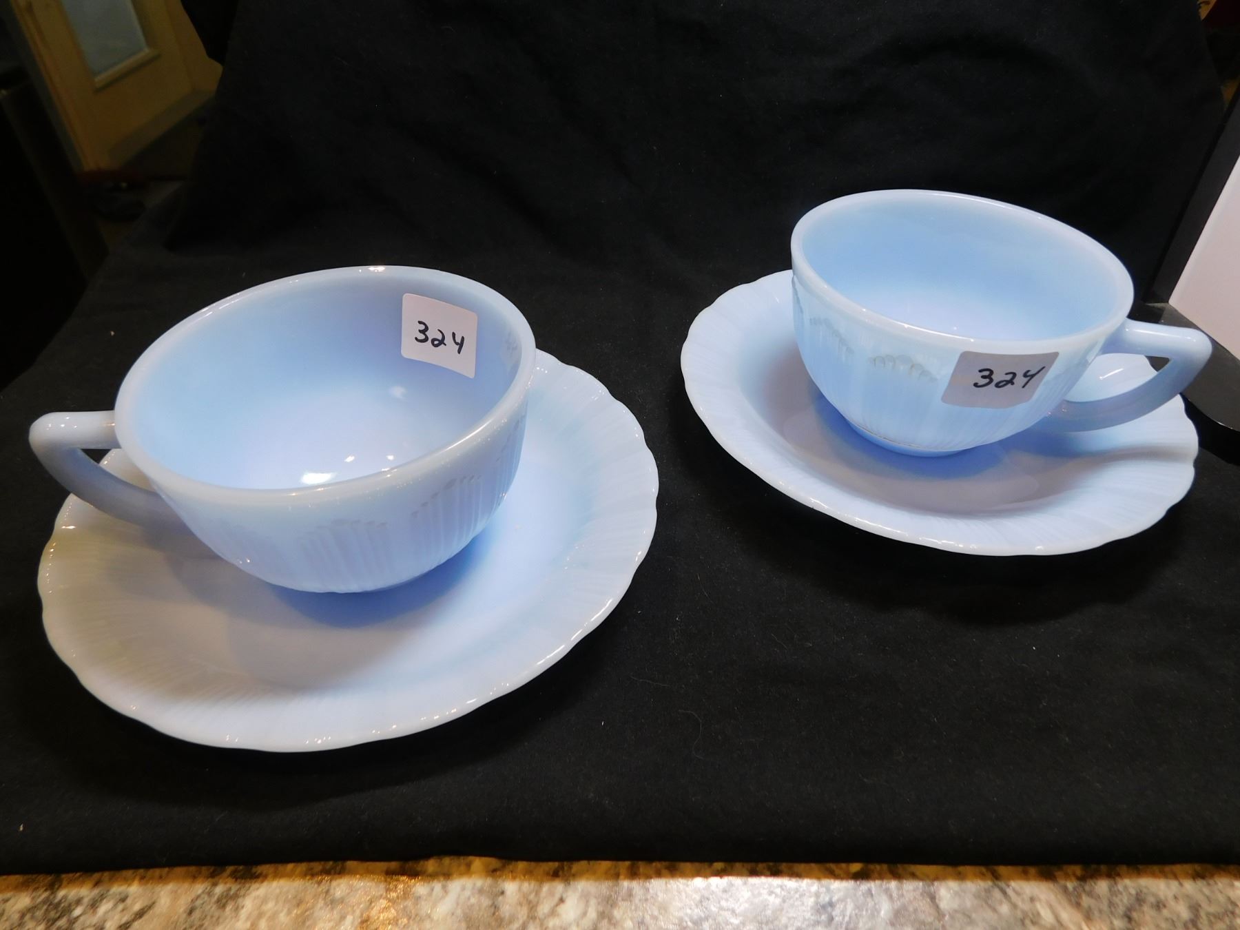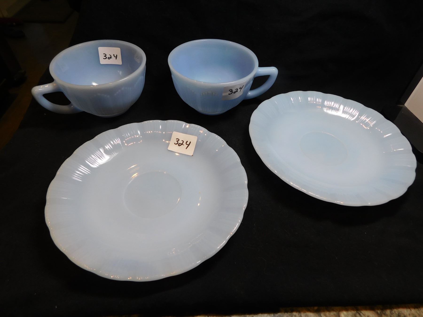 324. SET OF TWO, DELPHITE BLUE, PYREX, CUPS AND SAUCERS