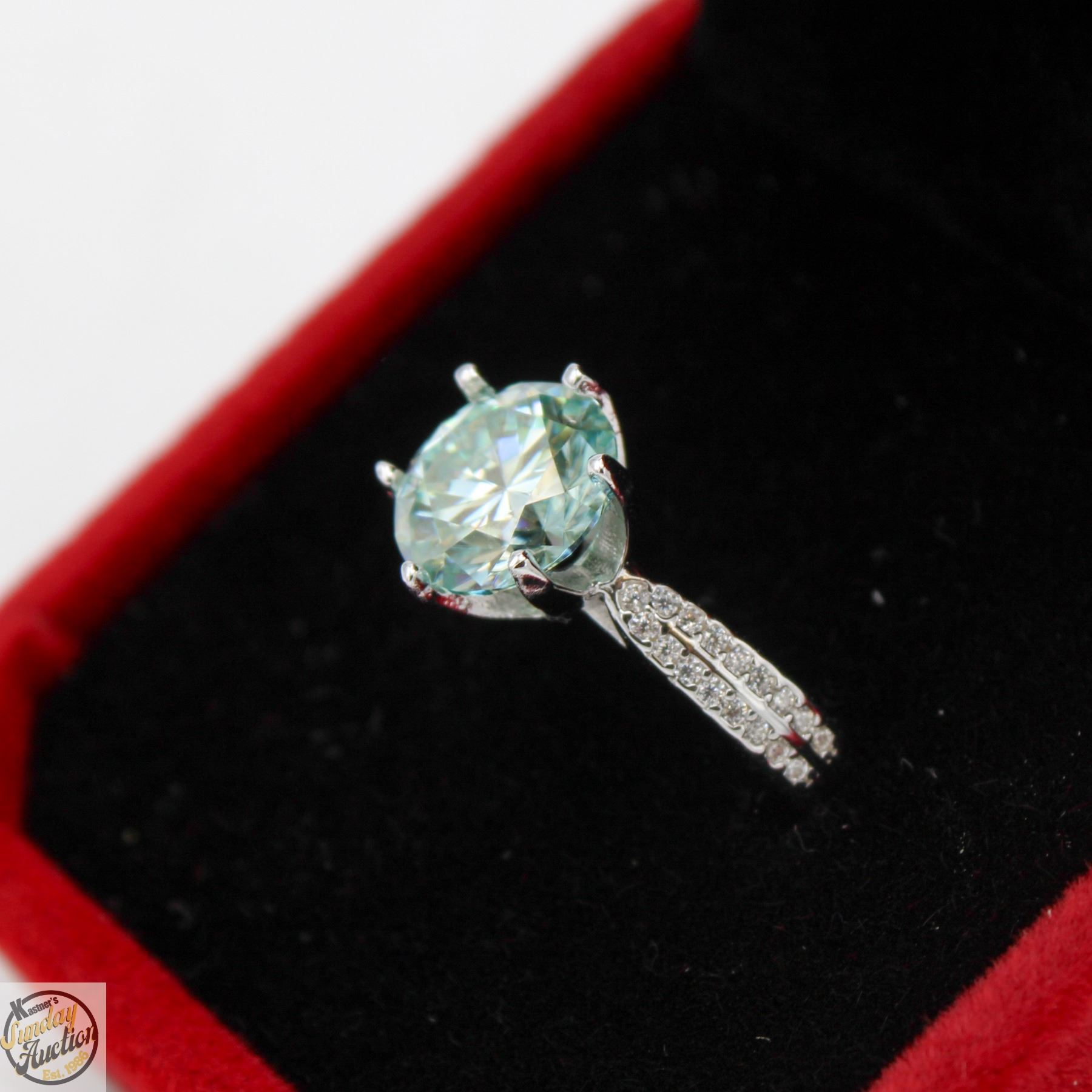 CUT MOISSANITE STONE VVS LIGHT BLUE COLOR SET IN CENTER WITH 34 ROUND BRILLIANT CUT CUBIC ZIRCONIA SET IN DUAL ROWS IN SHANKS AND SET IN 925 SILVER RING SIZE 6 RETAIL VALUE $1,275.00 **ALL ITEMS MUST BE REMOVED BY 5PM SATURDAY, NOVEMBER 8th 2025. ALL REMAINING ITEMS WILL BE SUBJECT TO A $6.00 PER DAY STORAGE CHARGE. ANY ITEMS REMAINING AFTER MONDAY, NOVEMBER 24TH 2025 WILL BE CONSIDERED FORFEITED. NO REFUNDS WILL BE ISSUED FOR FORFEITED ITEMS. TO SCHEDULE A PICK UP APPOINTMENT CLICK HERE