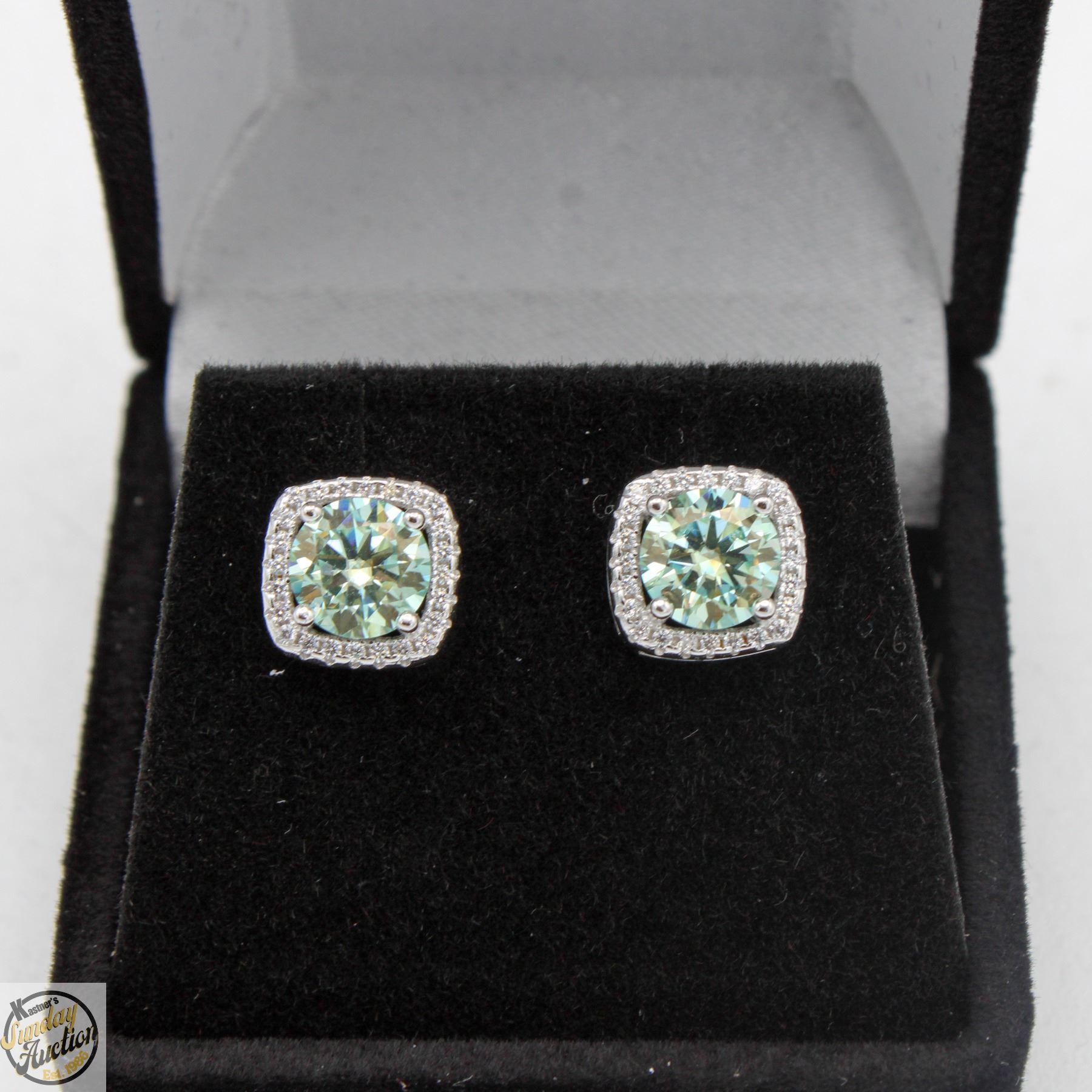 CUT MOISSANITE STONES VVS BLUE COLOR WITH 48 ROUND BRILLIANT CUT CUBIC ZIRCONIA SET IN SQUARE HALOS SET IN 925 SILVER EARRINGS **ALL ITEMS MUST BE REMOVED BY 5PM SATURDAY, NOVEMBER 8th 2025. ALL REMAINING ITEMS WILL BE SUBJECT TO A $6.00 PER DAY STORAGE CHARGE. ANY ITEMS REMAINING AFTER MONDAY, NOVEMBER 24TH 2025 WILL BE CONSIDERED FORFEITED. NO REFUNDS WILL BE ISSUED FOR FORFEITED ITEMS. TO SCHEDULE A PICK UP APPOINTMENT CLICK HERE