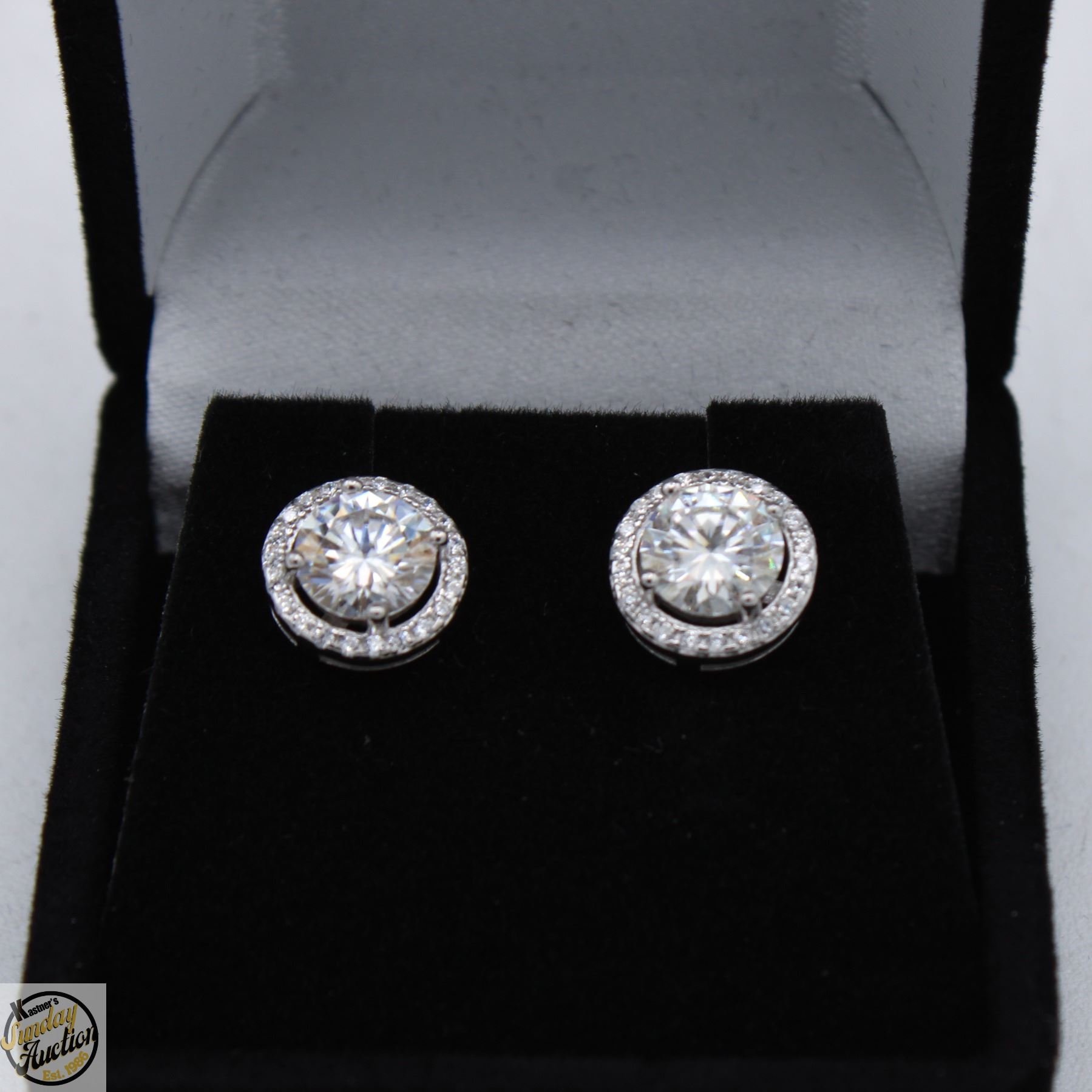 CUT MOISSANITE STONES VVS D COLOR WITH 40 ROUND BRILLIANT CUT CUBIC ZIRCONIA SET IN ROUND HALOS SET IN 925 SILVER EARRINGS RETAIL VALUE $950.00 **ALL ITEMS MUST BE REMOVED BY 5PM SATURDAY, SEPTEMBER 20TH 2025. ALL REMAINING ITEMS WILL BE SUBJECT TO A $6.00 PER DAY STORAGE CHARGE. ANY ITEMS REMAINING AFTER MONDAY, OCTOBER 6TH 2025 WILL BE CONSIDERED FORFEITED. NO REFUNDS WILL BE ISSUED FOR FORFEITED ITEMS. TO SCHEDULE A PICK UP APPOINTMENT CLICK HERE