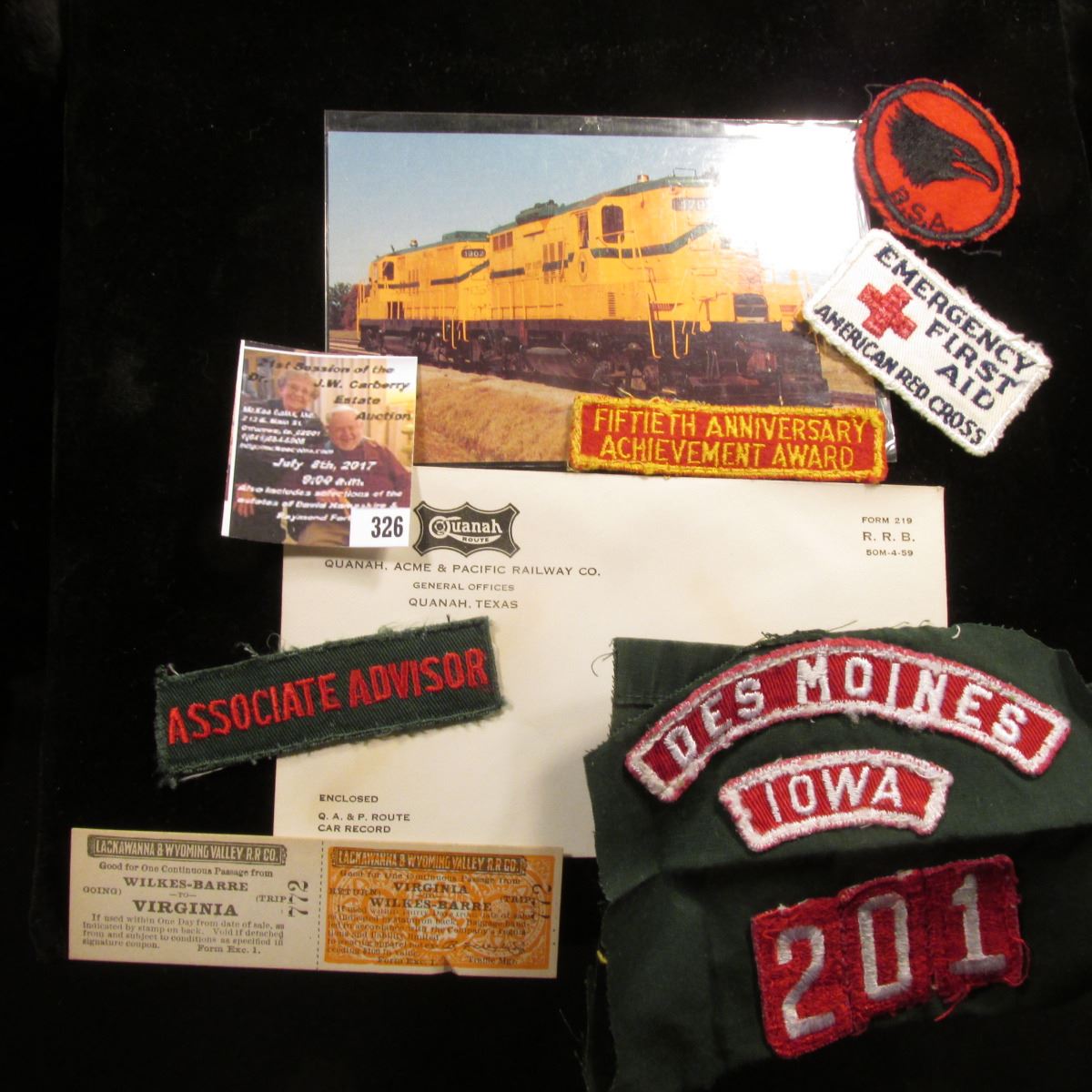 326.Return Envelope "Quanah Route Quanah, Acme & Pacific Railway Co…Quanah, Texas"; Ticket with Stub "Lackawanna & Wyoming Valley R.R. Co…Wilkes-Barre to Virginian"; Fort Smith Railroad Fort Smith, Arkansas Post card; & a group of Boy Scout Patches.