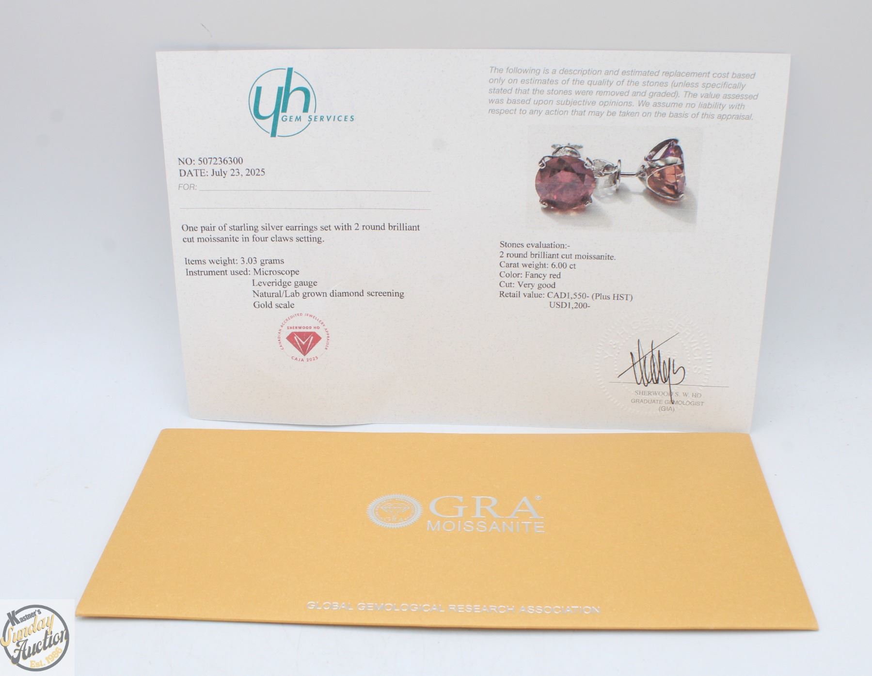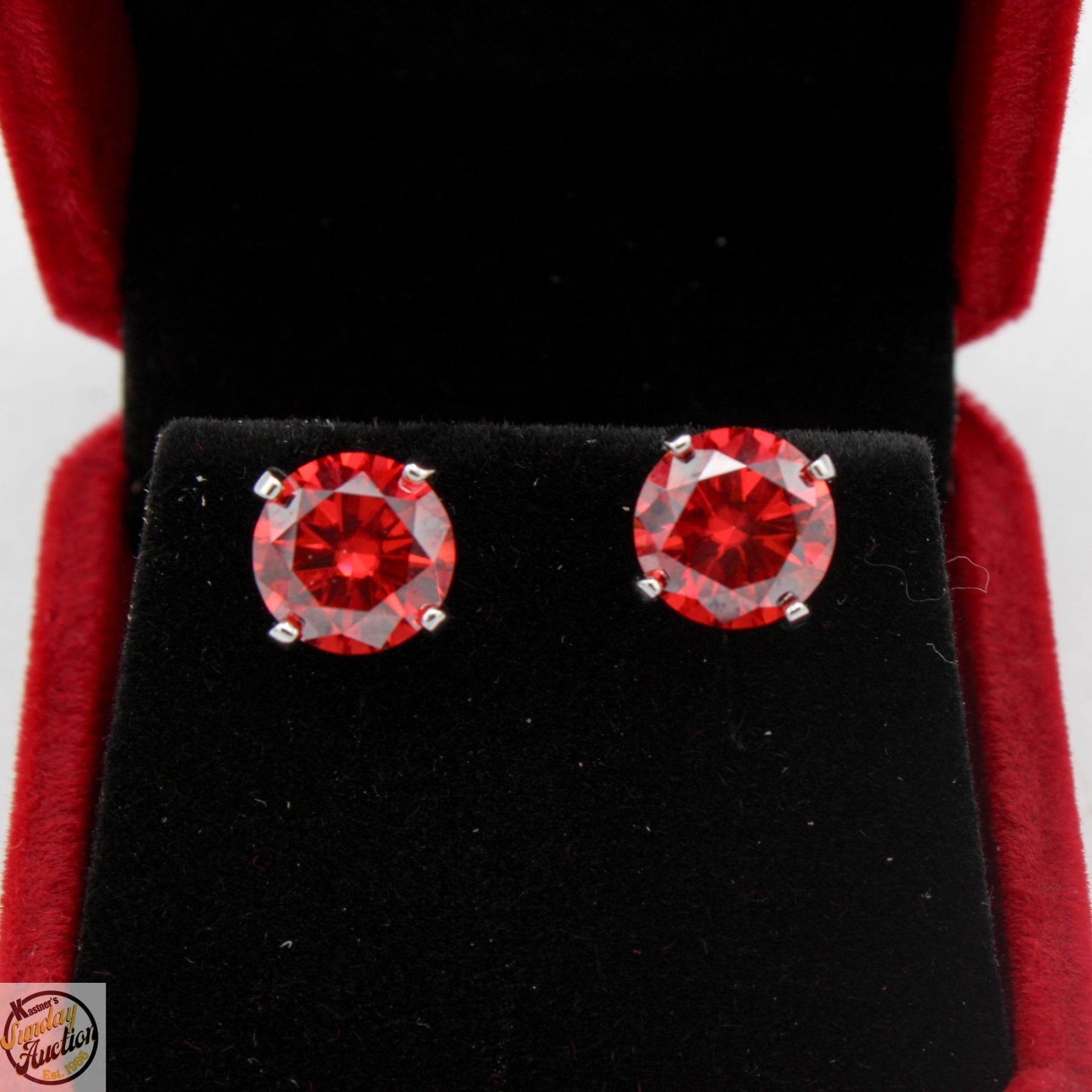 CUT MOISSANITE STONES VVS FANCY RED COLOR SET IN 4 CLAW V HEAD SET IN 925 SILVER EARRINGS RETAIL VALUE $1,550.00 **ALL ITEMS MUST BE REMOVED BY 5PM SATURDAY, OCTOBER 18TH 2025. ALL REMAINING ITEMS WILL BE SUBJECT TO A $6.00 PER DAY STORAGE CHARGE. ANY ITEMS REMAINING AFTER MONDAY, NOVEMBER 3RD 2025 WILL BE CONSIDERED FORFEITED. NO REFUNDS WILL BE ISSUED FOR FORFEITED ITEMS. TO SCHEDULE A PICK UP APPOINTMENT CLICK HERE