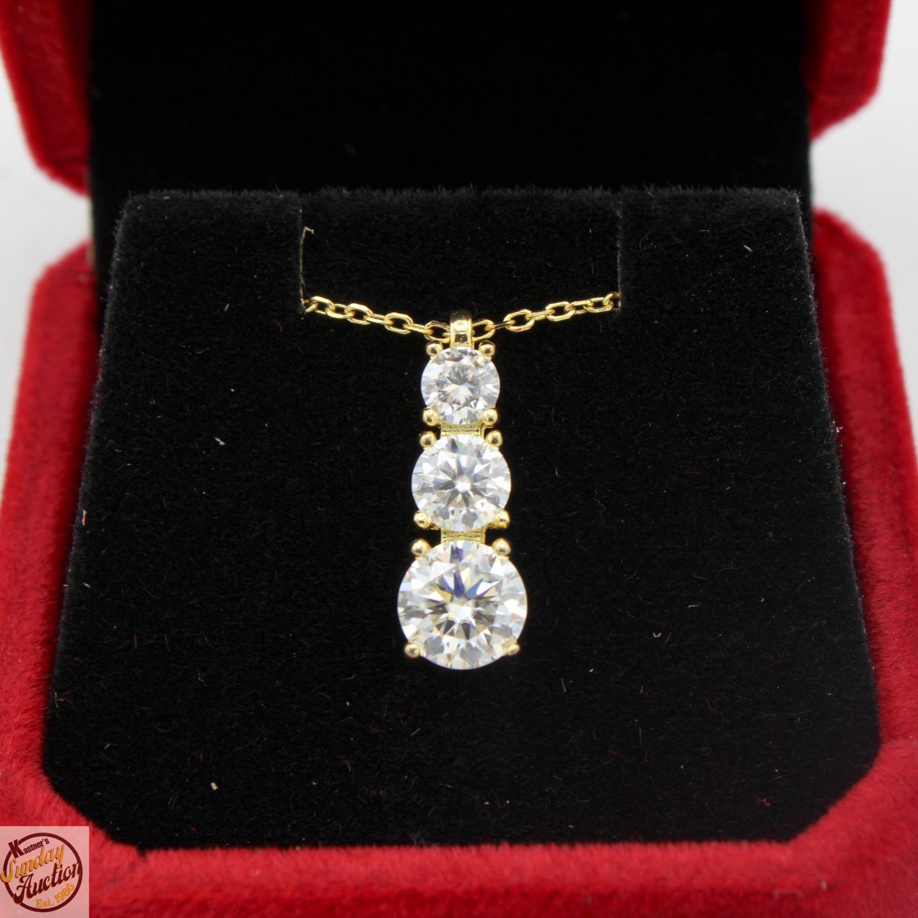 BRILLIANT CUT MOISSANITE STONE VVS D COLOR WITH THE 3 STONES GRADUATING UP IN SIZE SET IN 925 SILVER THAT IS YELLOW GOLD-PLATED PENDANT **ALL ITEMS MUST BE REMOVED BY 5PM SATURDAY, NOVEMBER 8th 2025. ALL REMAINING ITEMS WILL BE SUBJECT TO A $6.00 PER DAY STORAGE CHARGE. ANY ITEMS REMAINING AFTER MONDAY, NOVEMBER 24TH 2025 WILL BE CONSIDERED FORFEITED. NO REFUNDS WILL BE ISSUED FOR FORFEITED ITEMS. TO SCHEDULE A PICK UP APPOINTMENT CLICK HERE