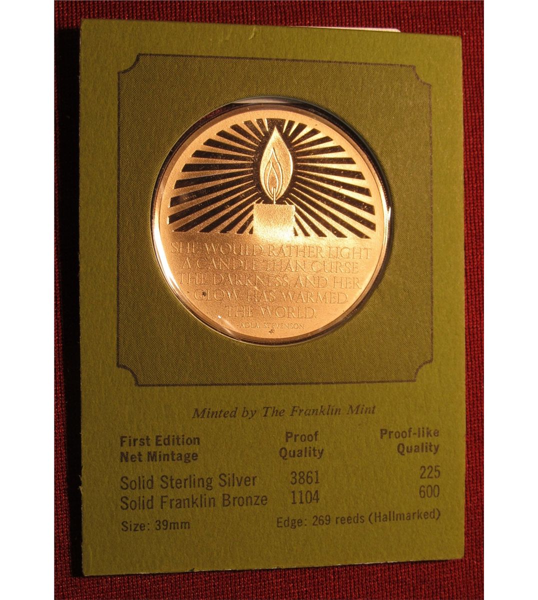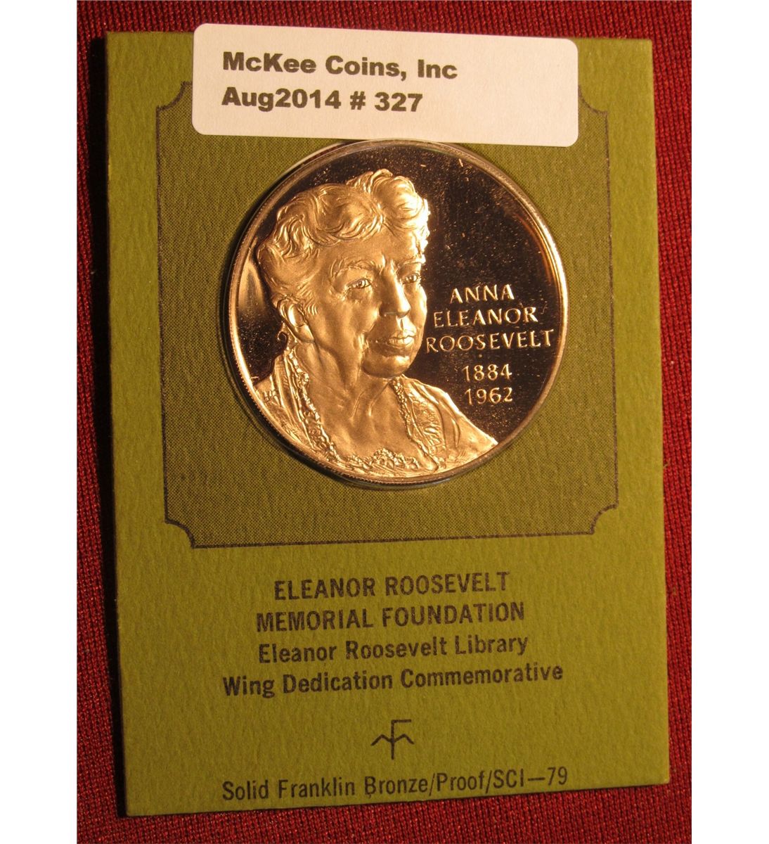 327. "Eleanor Roosevelt Memorial Foundation Eleanor Roosevelt Library Wing Dedication Commemorative" Proof Bronze Medal. 1 1/2" diameter. In original holder as issued by the Franklin Mint. Only 1,104 ever minted. Very rare.