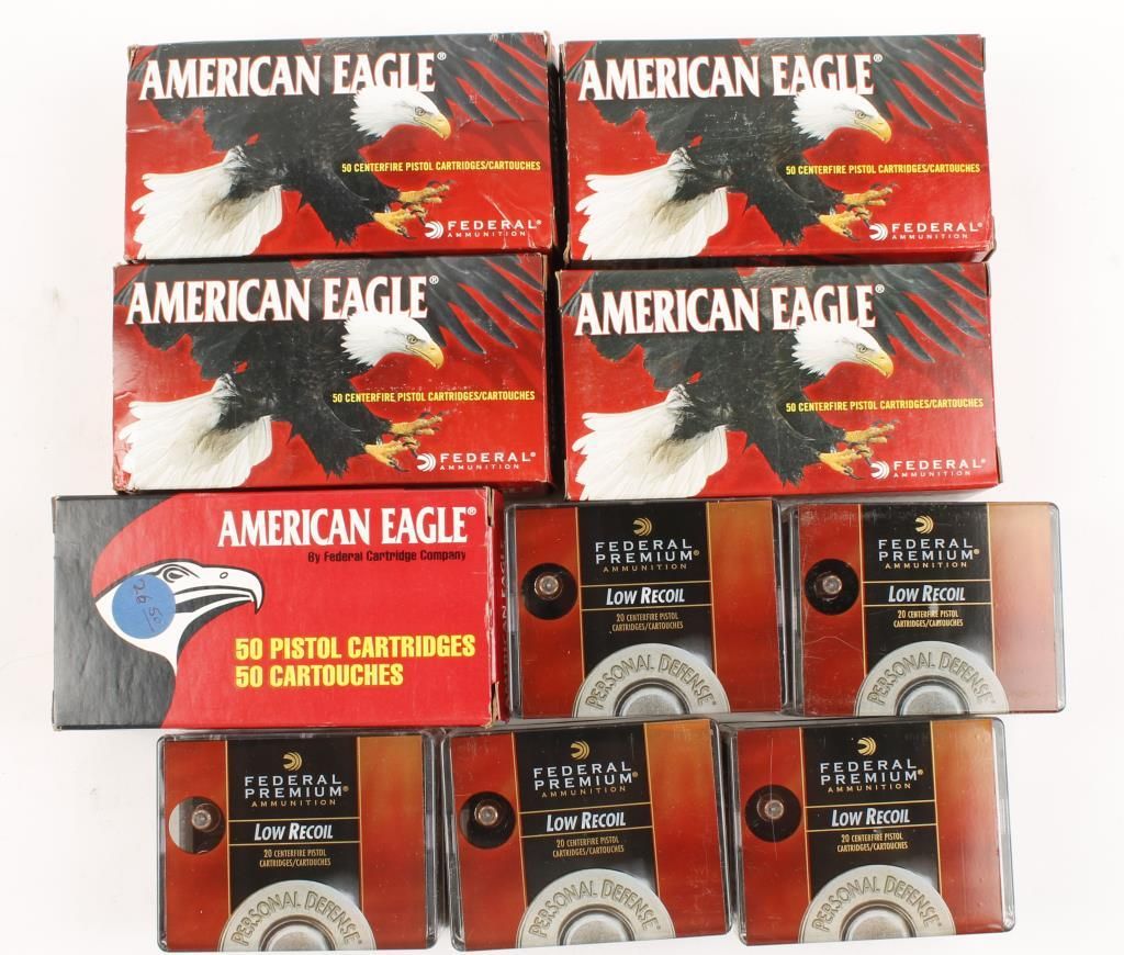 Total of (350) rounds. Includes American Eagle 100 grain jacket soft point and Federal Premium 85 grain Hydra-Shok JHP.