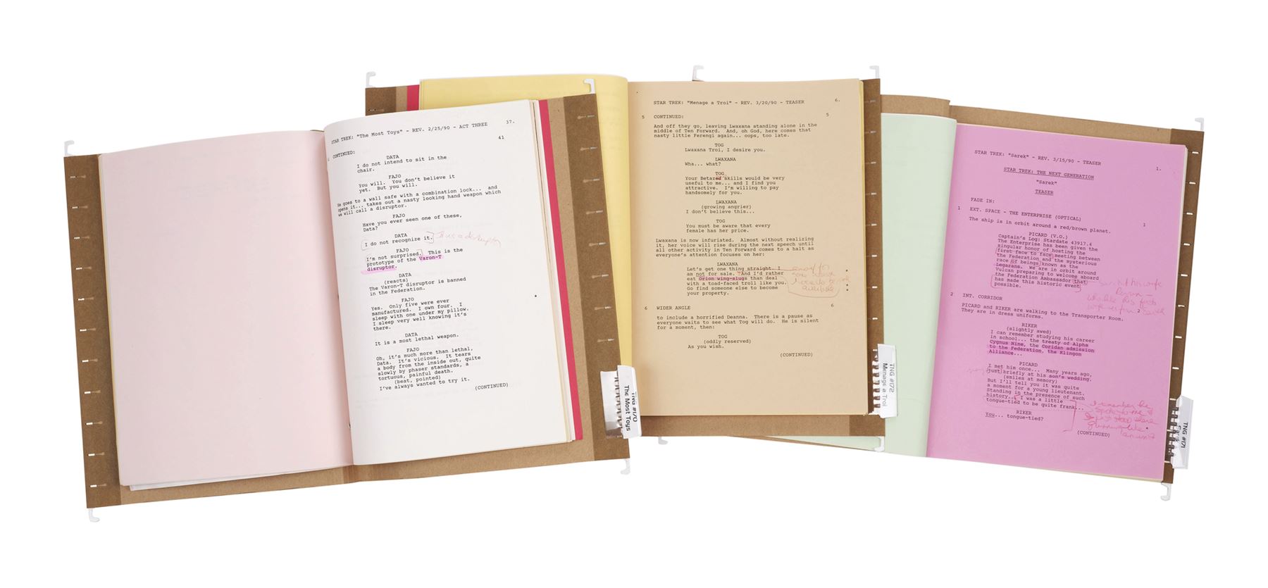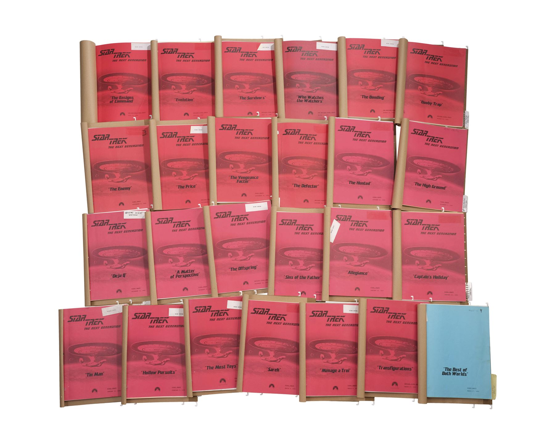 This lot comes from the collection of celebrated Star Trek franchise artists and advisors Michael and Denise Okuda. It consists of 25 scripts, one for every episode of the season except "Yesterday's Enterprise," each in labeled hanging folders with hand-annotated color-coded revision pages as well as call sheets and other production ephemera. Some of the labeling has fallen off over the years and the paper exhibits minor wear from use and age, including edge wear. Dimensions: (grouped) 12.5" x 11.5" x 13" (31.75 cm x 29.25 cm x 33.25 cm)Though their long and celebrated careers in the Star Trek world began in features, Michael and Denise Okuda established themselves as franchise legends while working on Star Trek: The Next Generation. Michael became art supervisor on TNG, while Denise came on as a scenic artist during Deep Space Nine, roles they would continue to perform through Voyager, Enterprise, and the Next Generation films. Married in 1993, the Okudas are known as the driving forces behind the development of many of the now-iconic 24th-century technologies seen throughout the series, including the famous "Okudagrams" they created for the LCARS (Library Computer Access and Retrieval System) interfaces . Propstore is proud to present a selection of key memorabilia from the personal collection of one of the franchise's most important creative teams to the public for the first time.