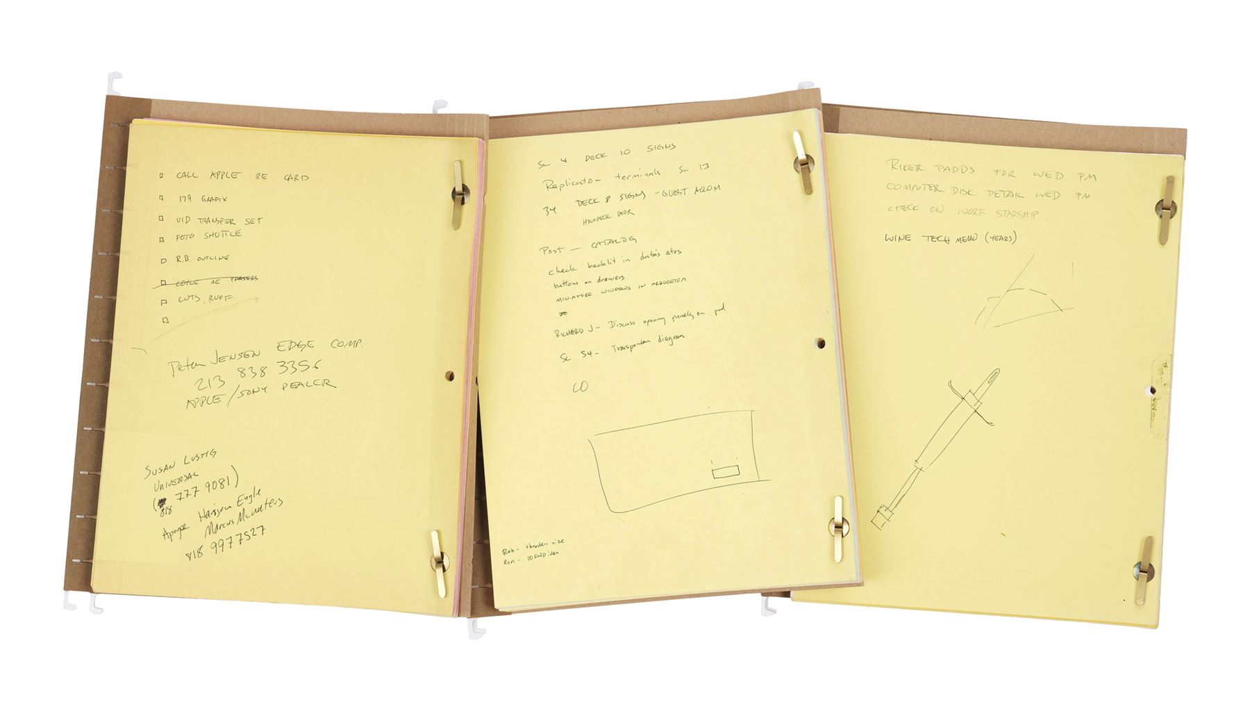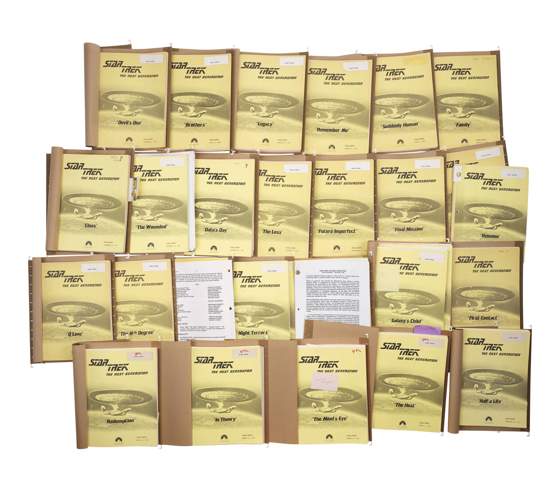 This lot comes from the collection of celebrated Star Trek franchise artists and advisors Michael and Denise Okuda. It consists of 27 scripts, one for each episode of the season excluding "The Best of Both Worlds, Part II" but including two copies of both "Galaxy's Child" (one marked "Set Copy") and "Reunion," each in labeled hanging folders with hand-annotated color-coded revision pages as well as call sheets and other production ephemera. Some of the labeling has fallen off over the years and the paper exhibits minor wear from use and age, including edge wear. Dimensions: (grouped) 13" x 10.5" x 14.5" (33.25 cm x 26.75 cm x 14 cm)Though their long and celebrated careers in the Star Trek world began in features, Michael and Denise Okuda established themselves as franchise legends while working on Star Trek: The Next Generation. Michael became art supervisor on TNG, while Denise came on as a scenic artist during Deep Space Nine, roles they would continue to perform through Voyager, Enterprise, and the Next Generation films. Married in 1993, the Okudas are known as the driving forces behind the development of many of the now-iconic 24th-century technologies seen throughout the series, including the famous "Okudagrams" they created for the LCARS (Library Computer Access and Retrieval System) interfaces . Propstore is proud to present a selection of key memorabilia from the personal collection of one of the franchise's most important creative teams to the public for the first time.