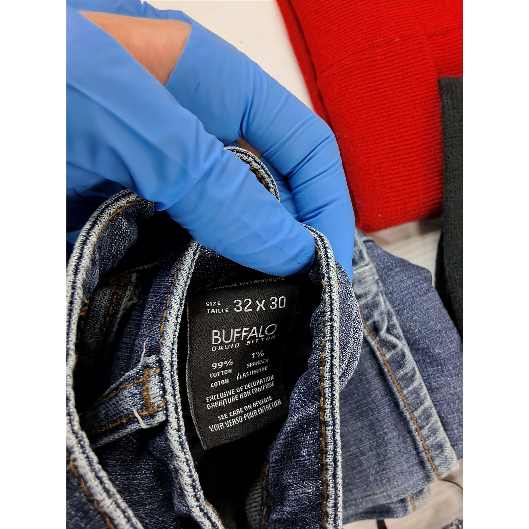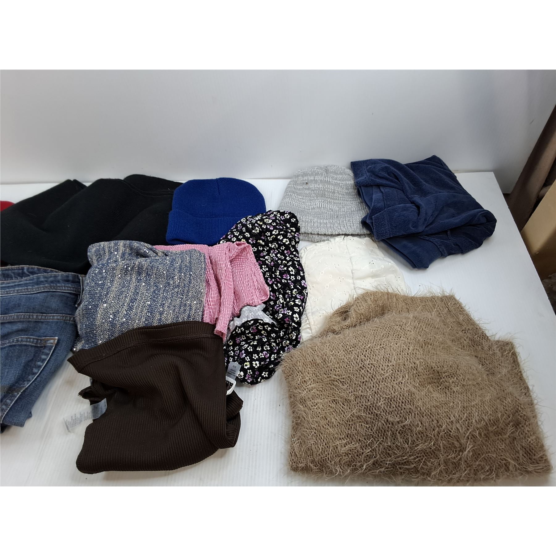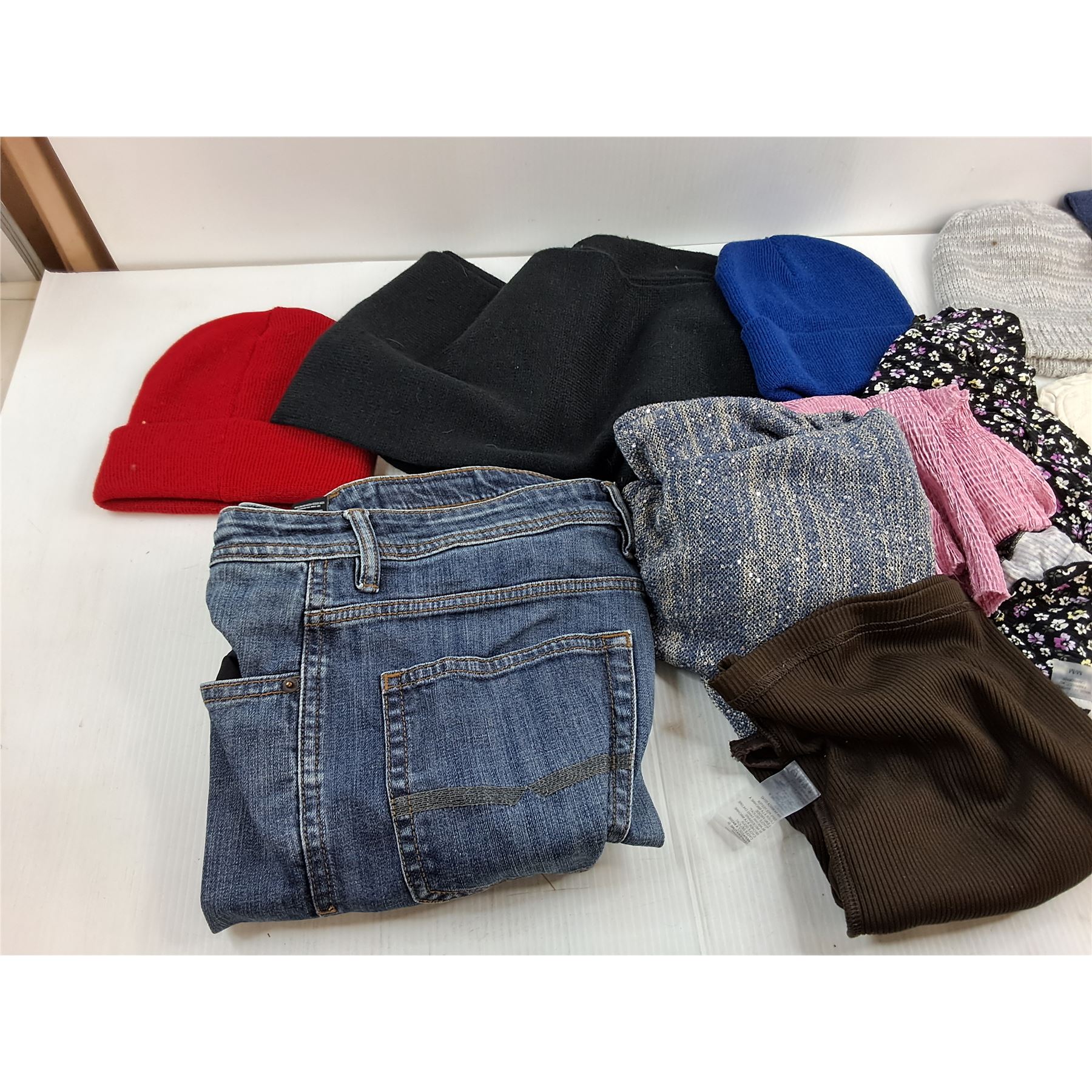 32x30 Buffalo Jeans, (3) Beanies, (2) Scarfs, Misc