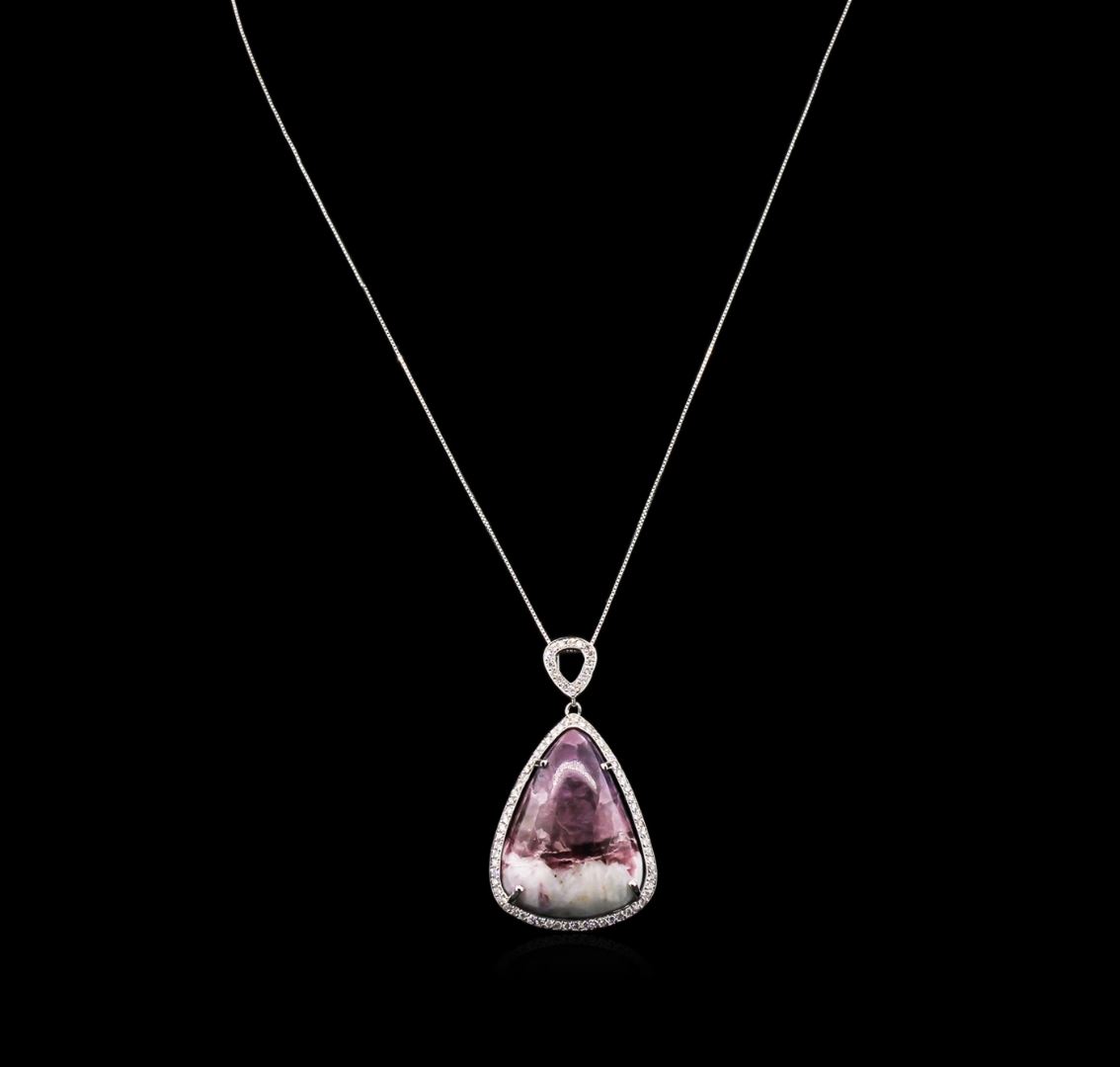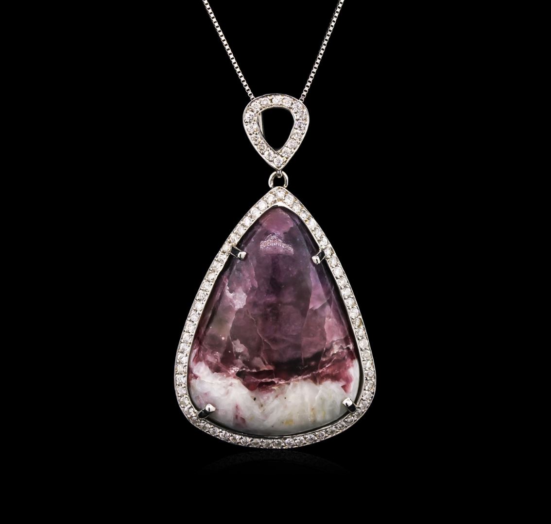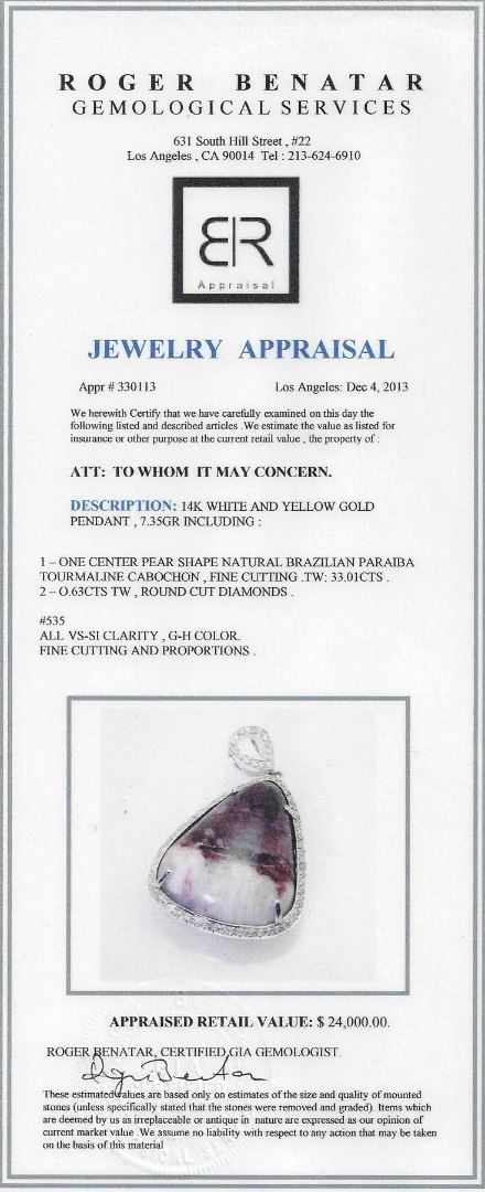 14K white and yellow gold pendant, 7.35gr including: 1- One center pear shape natural Brazilian Paraiba tourmaline cabochon, fine cutting. TW: 33.01cts. 2- 0.63cts tw, round cut diamonds. #535 All VS-SI clarity, G-H color. Fine cutting and proportions. RBGS Appraised at $24,000.00.