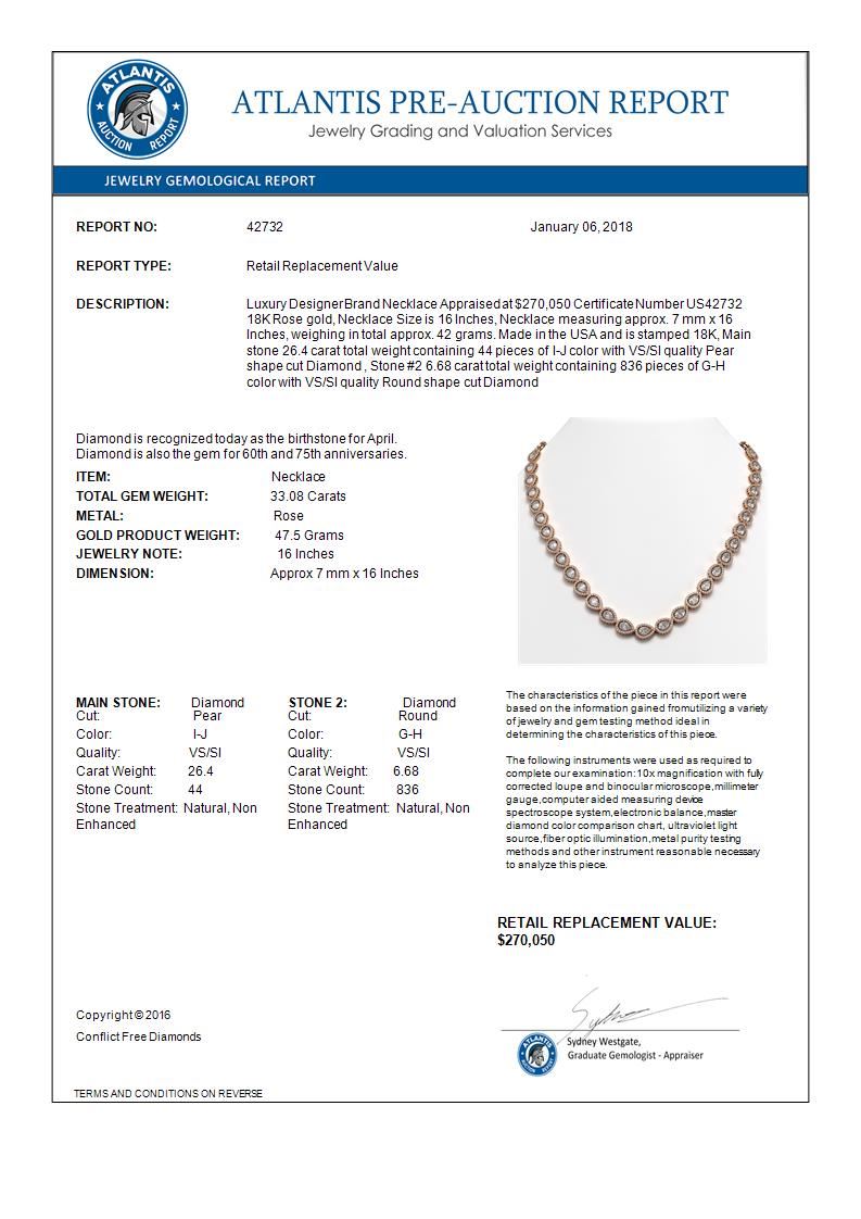 REF-6137W3F -42732 ---- 33.08 CTW Pear Diamond Designer Necklace 18K Rose Gold ---- Luxury Designer Brand Necklace Appraised at $270,050 Certificate Number US42732 18K Rose gold, Necklace Size is 16 Inches, Necklace measuring approx. 7 mm x 16 Inches, weighing in total approx. 42 grams. Made in the USA and is stamped 18K, Main stone 26.4 carat total weight containing 44 pieces of I-J color with VS/SI quality Pear shape cut Diamond , Stone #2 6.68 carat total weight containing 836 pieces of G-H color with VS/SI quality Round shape cut Diamond