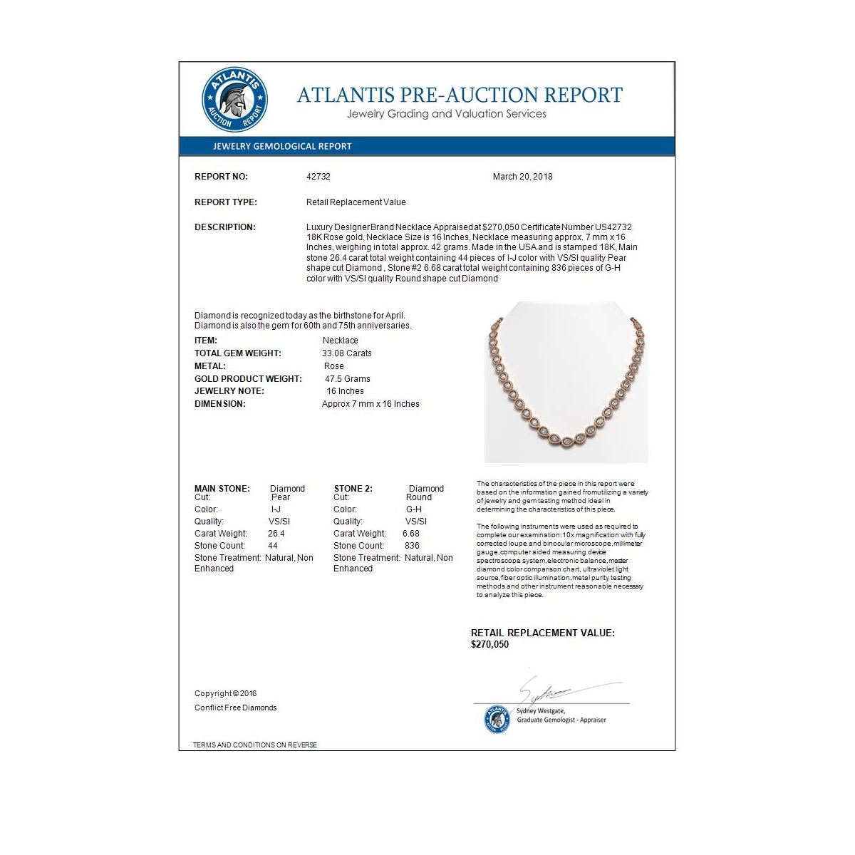 REF-6137W3F -42732 ---- 33.08 CTW Pear Diamond Designer Necklace 18K Rose Gold ---- Luxury Designer Brand Necklace Appraised at $270,050 Certificate Number US42732 18K Rose gold, Necklace Size is 16 Inches, Necklace measuring approx. 7 mm x 16 Inches, weighing in total approx. 42 grams. Made in the USA and is stamped 18K, Main stone 26.4 carat total weight containing 44 pieces of I-J color with VS/SI quality Pear shape cut Diamond , Stone #2 6.68 carat total weight containing 836 pieces of G-H color with VS/SI quality Round shape cut Diamond