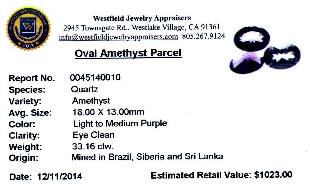 33.16ctw. Oval Amethyst Parcel Westfield Appraised at $1,023.00.