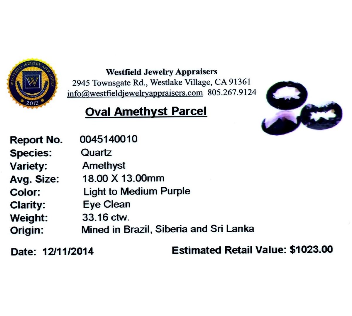 33.16ctw. Oval Amethyst Parcel Westfield Appraised at $1,023.00.
