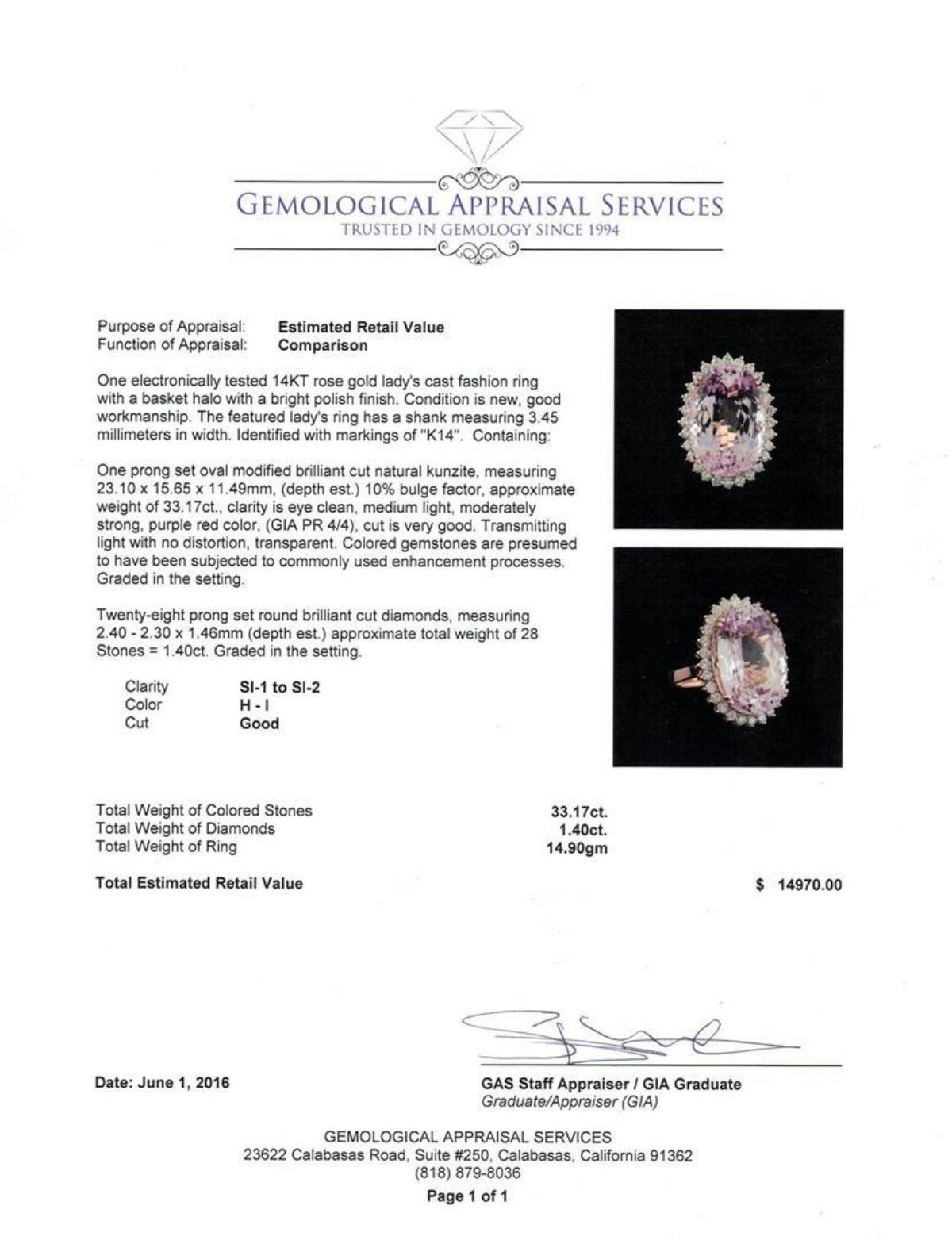 One electronically tested 14KT rose gold lady's cast fashion ring with a basket halo with a bright polish finish. The featured lady's ring has a shank measuring 3.45 millimeters in width. Identified with markings of "K14". Condition is new, good workmanship. Containing: One prong set oval modified brilliant cut natural kunzite, measuring 23.10 x 15.65 x 11.49mm, (depth est.) 10%. bulge factor, approximate weight of 33.17ct., clarity is eye clean, medium light, moderately strong, purple red color, (GIA PR 4/4), cut is very good. Transmitting light with no distortion, transparent. Colored gemstones are presumed to have been subjected to commonly used enhancement processes. Graded in the setting. Twenty-Eight prong set round brilliant cut diamonds, measuring 2.40 - 2.30 x 1.46mm (depth est.) approximate total weight of 28 Stones = 1.40ct. Graded in the setting. Clarity: SI-1 to SI-2. Color: H - I. Cut Good. Total Weight of Colored Stones 33.17ct. Total Weight of Diamonds 1.40ct. Total Weight of Ring 14.90gm. GAS Appraised.