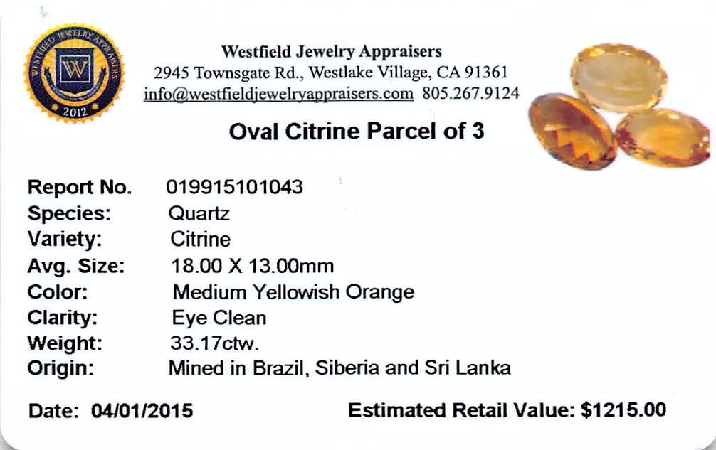 Three oval mixed cut natural citrine quartzs exact total weight 33.17ct., clarity is eye clean, type I, medium, slightly brownish, yellowish orange color, (GIA yO 5/2), cut is good. Westfield Appraised at $1,215.00.