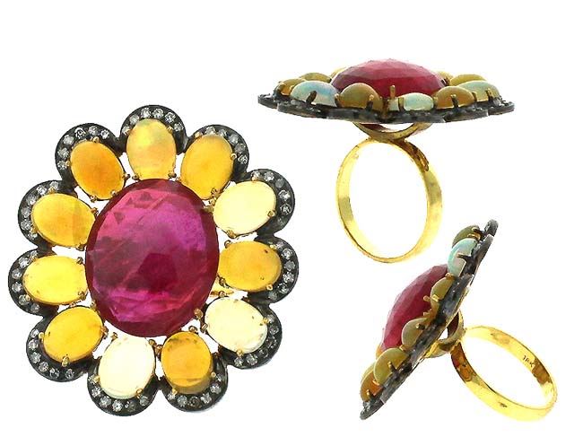 33.22 TCW FLOWER SHAPEOPAL , RUBY & DIAMOND RING 18K GOLD & SILVER