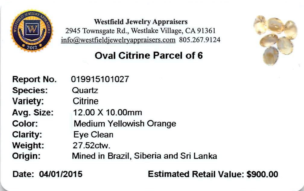 Eight oval mixed cut natural citrine quartzs exact total weight 33.34ct., clarity is eye clean, type I, medium, slightly brownish, orangy yellow color, (GIA oY 5/2), cut is good. Westfield Appraised at $1,090.00.