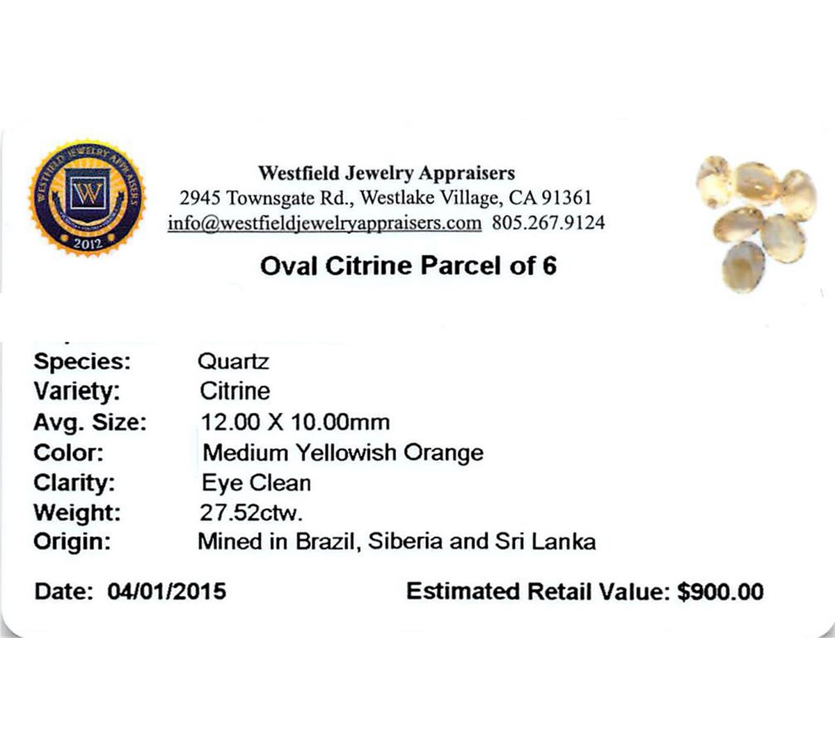 Eight oval mixed cut natural citrine quartzs exact total weight 33.34ct., clarity is eye clean, type I, medium, slightly brownish, orangy yellow color, (GIA oY 5/2), cut is good. Westfield Appraised at $1,090.00.