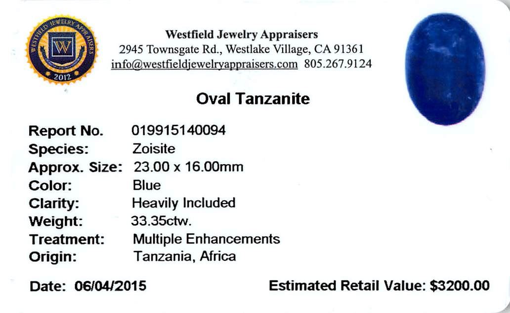 One oval cabochon cut natural tanzanite, measuring 23.00 x 16.00 x 10.00mm, exact weight 33.35ct., clarity is heavily included, type I, dark, very slightly grayish, blue color, (GIA B 7/3), cut is good. Transmitting light somewhat diffusely, transparent to translucent. Naturally occurring internal & external characteristics are present. Indications of heat treatment. Westfield Appraised at $3,200.00.