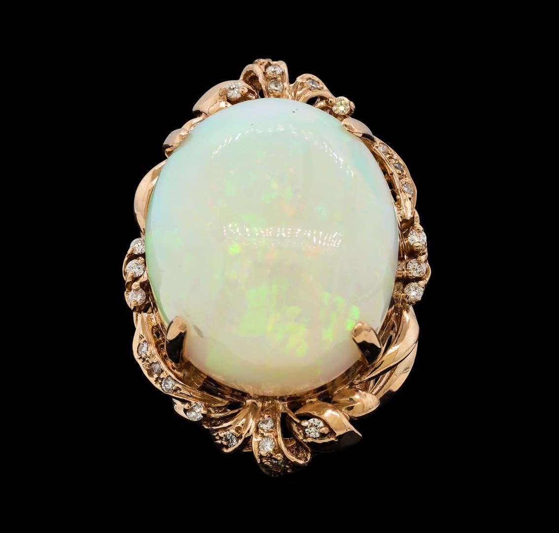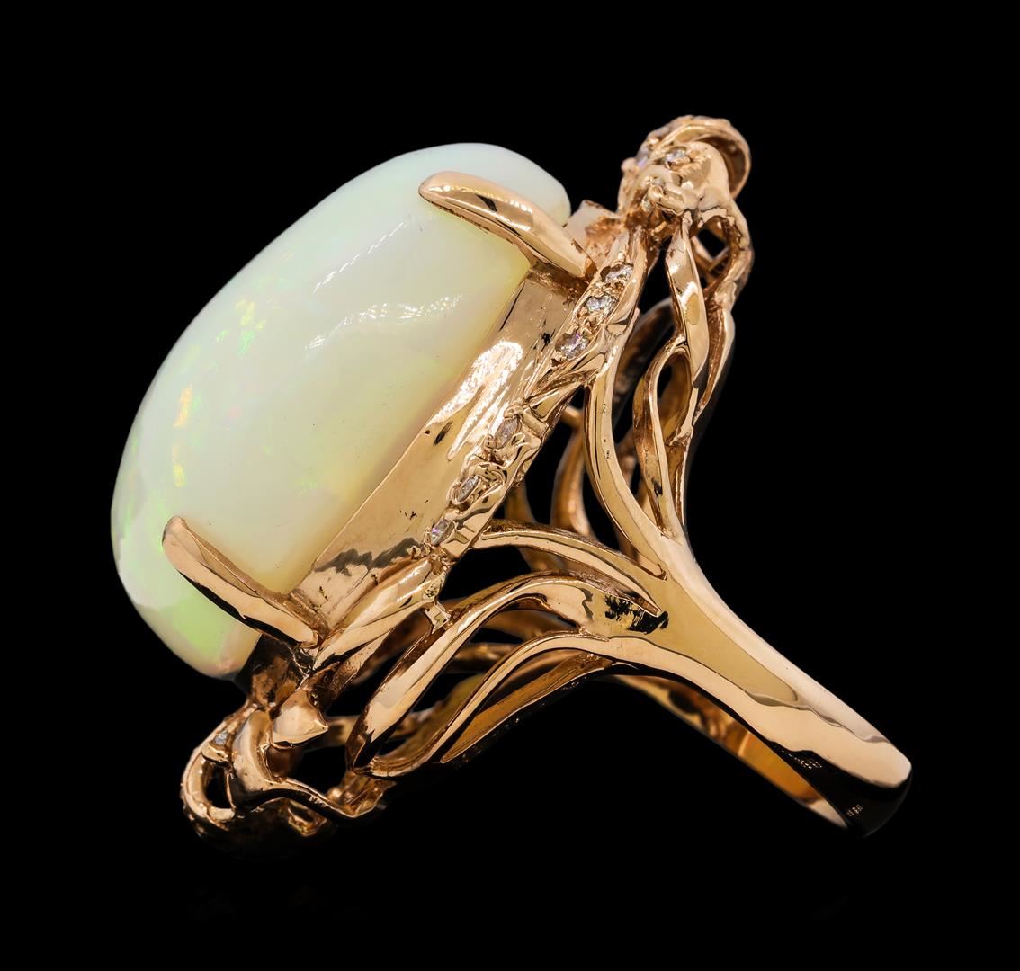 One electronically tested 14KT rose gold lady's cast fashion ring with a bright polish finish. The featured lady's ring has a center gemstone surrounded by ribbons of shaped rose gold and a shank measuring 3.93 millimeters wide. Identified with markings of '14K'. Condition is new, good workmanship. Containing: One crystal opal that is cut in a oval shaped cabochon and is prong set, measuring 26.80 mm long x 22.06 mm wide, and 13.40 mm thick and the approximate weight is 33.41 carats. The opal has a bright, multicolor play of color (fire) in a rolling flashfire pattern; a medium dome; a good cut; no inclusions; minor dull spot in its brightness and pattern; and is somewhat directional. Graded in the setting. Ten prong set round brilliant cut diamonds, measuring 1.70 - 1.65 x 1.04mm (depth est.) approximate total weight of 10 Stones = 0.18ct. Graded in the setting. Clarity SI-1 to SI-2. Color: H - I Cut Good Fourteen prong set round brilliant cut diamonds, measuring 1.50 - 1.45 x 0.92mm (depth est.) approximate total weight of 14 Stones = 0.18ct. Graded in the setting. Clarity SI-1 to SI-2. Color: H - I Cut Good. Total Weight of Diamonds 0.36ct.. Total Weight of Opals 33.41ct.. Total Weight of Ring 19.60gm. GAS Appraised at $9,865.00.