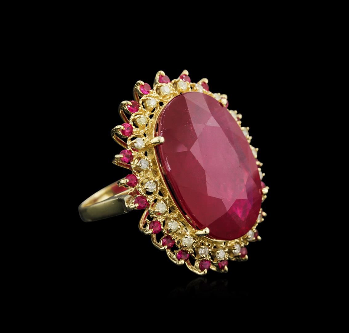 One electronically tested yellow gold ladies cast ruby and diamond ring with a bright and patterned finish. Condition is new, good workmanship. The featured ruby is set within a ruby and diamond gallery, completed bya two and one-half millimeter wide band. Identified with markings of "K14". Containing: One prong set oval mixed cut natural ruby, measuring 23.25 x 17.00 x 8.30mm, 8% bulge factor, approximate weight of 32.60ct. with a strong Red fluorescence, clarity is heavily included, type II, medium dark, moderately strong, slightly purplish red color, (GIA slpR 6/4), cut is good. Transmitting light somewhat diffusely, transparent to translucent. Naturally occurring internal & external characteristics are present. Indications of laboratory high temperature heat treatment, with glass & flux additives. Colored Stone Grading Report attached. Graded in the setting. Twenty-two prong set round brilliant cut natural rubies, measuring 2.00 - 1.90 x 1.27 mm, approximate total weight of 0.84ct., clarity is slightly included, type II, medium dark, moderately strong, slightly purplish red color, (GIA slpR 6/4), cut is good. Transmitting light somewhat diffusely, transparent to translucent. Naturally occurring internal & external characteristics are present. Indications of laboratory high temperature heat treatment, with glass& flux additives. Color grade is an average for the group. Graded in the setting. Ruby has a low tolerance to rhodium plating, repolishing the surface, & ultrasonic cleaning. Twenty-two prong set round brilliant cut diamonds, measuring 1.70 - 1.70 x 1.02mm (depth est.) approximate total weight of 22 Stones = 0.43ct. Graded in the setting. Clarity: 1-1 to 1-3.Color: H - J. AIG Appraised at $11,210.00.