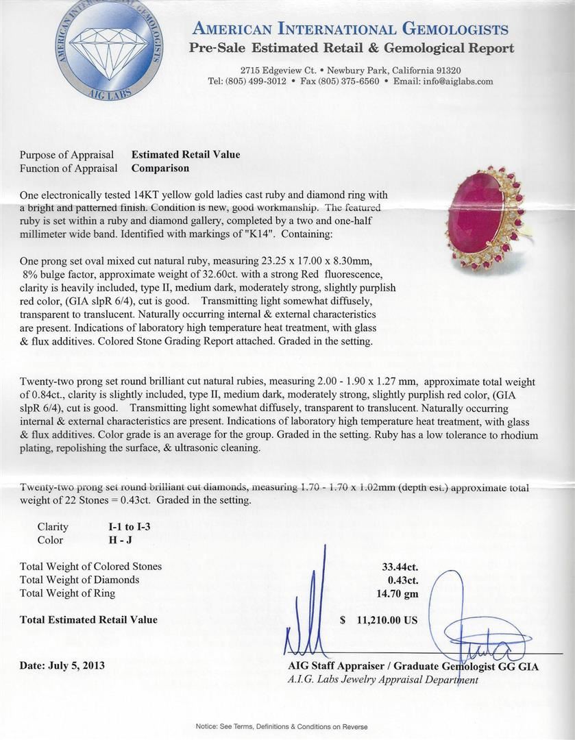 One electronically tested yellow gold ladies cast ruby and diamond ring with a bright and patterned finish. Condition is new, good workmanship. The featured ruby is set within a ruby and diamond gallery, completed bya two and one-half millimeter wide band. Identified with markings of "K14". Containing: One prong set oval mixed cut natural ruby, measuring 23.25 x 17.00 x 8.30mm, 8% bulge factor, approximate weight of 32.60ct. with a strong Red fluorescence, clarity is heavily included, type II, medium dark, moderately strong, slightly purplish red color, (GIA slpR 6/4), cut is good. Transmitting light somewhat diffusely, transparent to translucent. Naturally occurring internal & external characteristics are present. Indications of laboratory high temperature heat treatment, with glass & flux additives. Colored Stone Grading Report attached. Graded in the setting. Twenty-two prong set round brilliant cut natural rubies, measuring 2.00 - 1.90 x 1.27 mm, approximate total weight of 0.84ct., clarity is slightly included, type II, medium dark, moderately strong, slightly purplish red color, (GIA slpR 6/4), cut is good. Transmitting light somewhat diffusely, transparent to translucent. Naturally occurring internal & external characteristics are present. Indications of laboratory high temperature heat treatment, with glass& flux additives. Color grade is an average for the group. Graded in the setting. Ruby has a low tolerance to rhodium plating, repolishing the surface, & ultrasonic cleaning. Twenty-two prong set round brilliant cut diamonds, measuring 1.70 - 1.70 x 1.02mm (depth est.) approximate total weight of 22 Stones = 0.43ct. Graded in the setting. Clarity: 1-1 to 1-3.Color: H - J. AIG Appraised at $11,210.00.