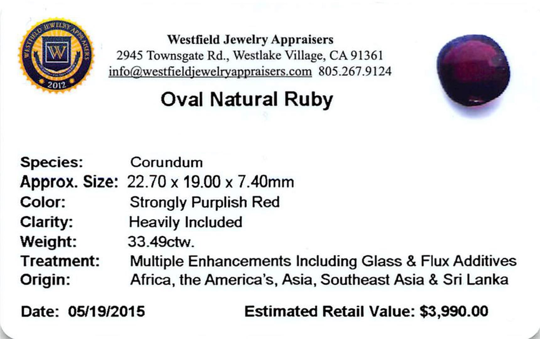 One oval mixed cut natural ruby, measuring 22.70 x 19.00 x 7.40mm, exact weight 33.49ct., clarity is heavily included, type II, dark, very slightly brownish, strongly purplish red color, (GIA stpR 7/3), cut is good. Transmitting light somewhat diffusely, translucent. Naturally occurring internal & external characteristics are present. Indications of laboratory high temperature heat treatment, with glass & flux additives. Westfield Appraised at $3,990.00.