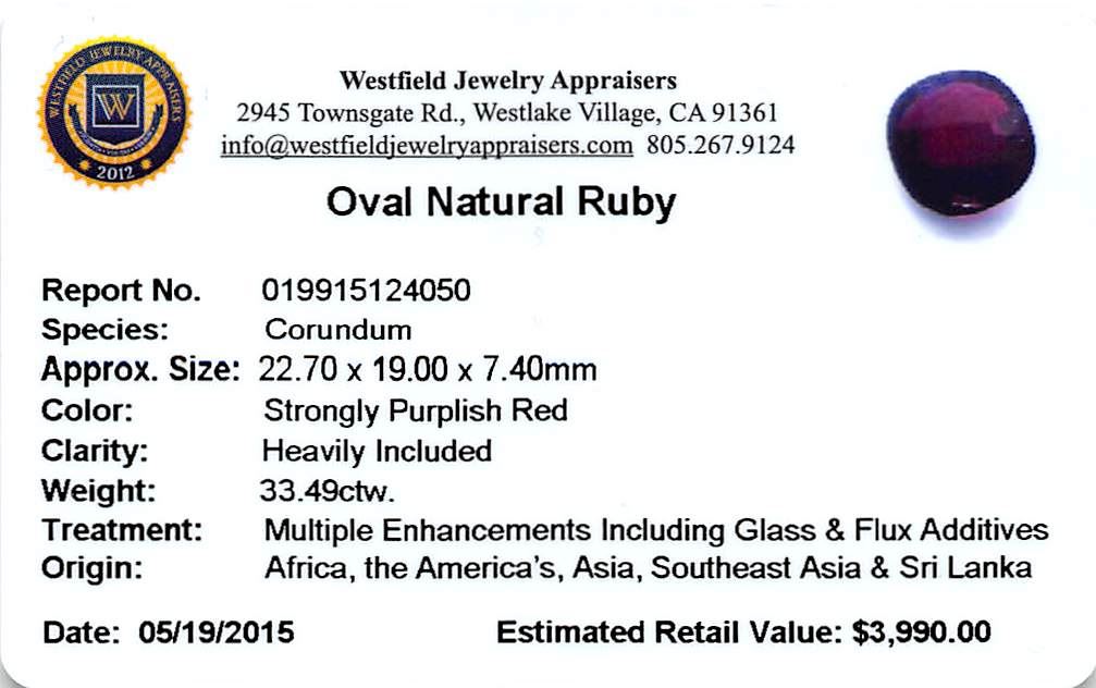 One oval mixed cut natural ruby, measuring 22.70 x 19.00 x 7.40mm, exact weight 33.49ct., clarity is heavily included, type II, dark, very slightly brownish, strongly purplish red color, (GIA stpR 7/3), cut is good. Transmitting light somewhat diffusely, translucent. Naturally occurring internal & external characteristics are present. Indications of laboratory high temperature heat treatment, with glass & flux additives. Westfield Appraised at $3,990.00.