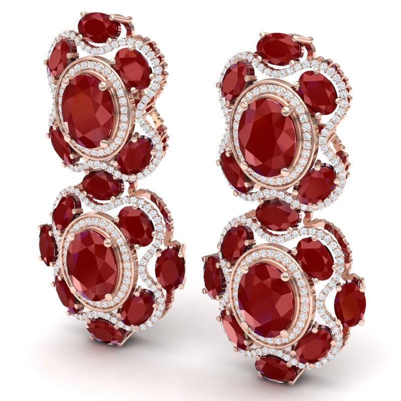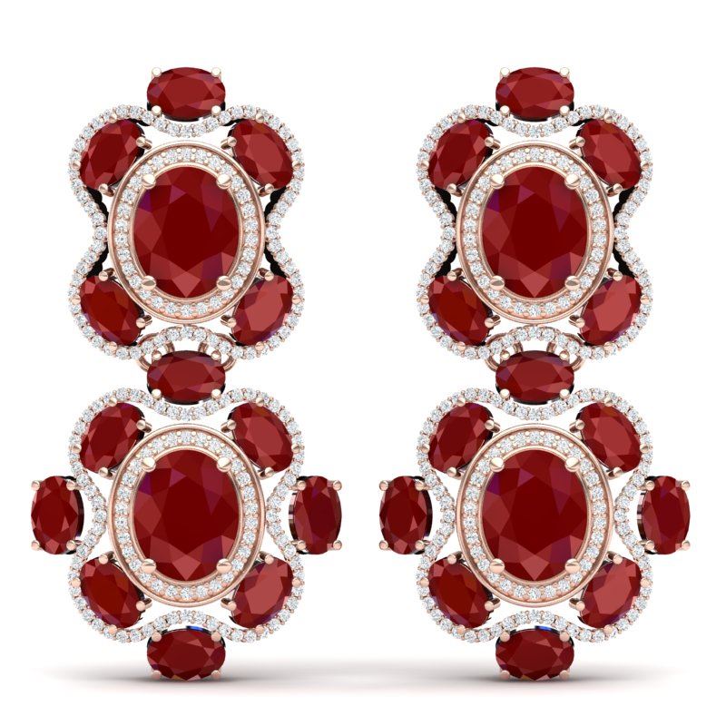 33.5 CTW Royalty Designer Ruby & VS Diamond Earrings 18K Rose Gold ---- Luxury Designer Brand Earring Appraised Retail Price at $45,600 ---- SKU Number US39313 18K Rose gold Earring Size is 47 Millimeter long, Earring measuring approx. 2 x 1 Inches, weighing in total approx. 20 grams. Made in the USA and is stamped 18K, Main stone 13.6 carat total weight containing 4 pieces of Intense Mid-Opaque Red color with AAA quality Oval shape cut Ruby , Stone #2 16.9 carat total weight containing 26 pieces of Intense Mid-Opaque Red color with AAA quality Oval shape cut