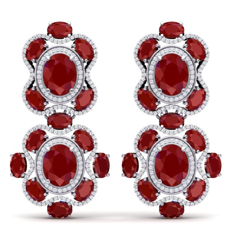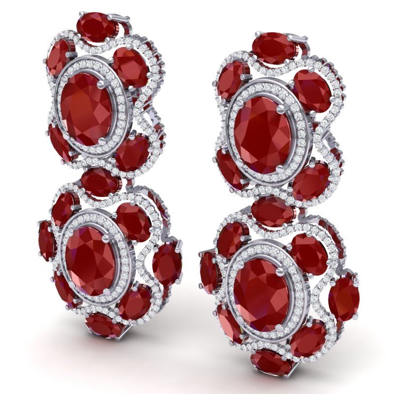 33.5 CTW Royalty Designer Ruby & VS Diamond Earrings 18K White Gold ---- Luxury Designer Brand Earring Appraised Retail Price at $45,600 ---- SKU Number US39312 18K White gold Earring Size is 47 Millimeter long, Earring measuring approx. 2 x 1 Inches, weighing in total approx. 20 grams. Made in the USA and is stamped 18K, Main stone 13.6 carat total weight containing 4 pieces of Intense Mid-Opaque Red color with AAA quality Oval shape cut Ruby , Stone #2 16.9 carat total weight containing 26 pieces of Intense Mid-Opaque Red color with AAA quality Oval shape cut