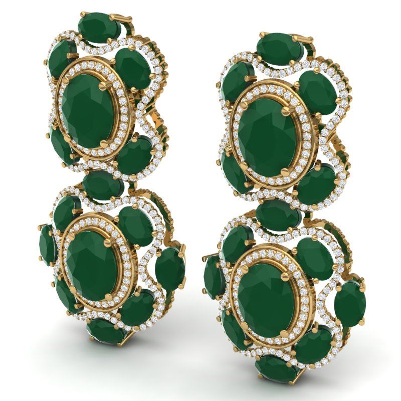 33.5 CTW Royalty Emerald & VS Diamond Earrings 18K Yellow Gold ---- Luxury Designer Brand Earring Appraised Retail Price at $45,600 ---- SKU Number US39311 18K Yellow gold Earring Size is 47 Millimeter long, Earring measuring approx. 2 x 1 Inches, weighing in total approx. 20 grams. Made in the USA and is stamped 18K, Main stone 13.6 carat total weight containing 4 pieces of Intense Mid-Opaque Green color with AAA quality Oval shape cut Emerald , Stone #2 16.9 carat total weight containing 26 pieces of Intense Mid-Opaque Green color with AAA quality Oval shape cut
