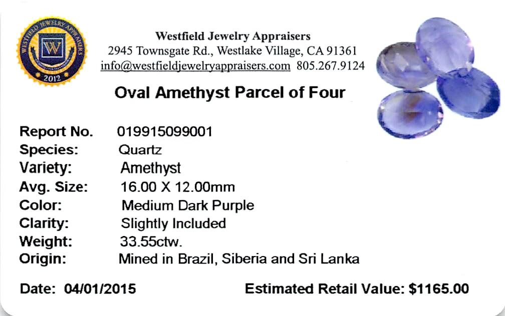 Four oval mixed cut natural amethysts exact total weight 33.55ct., clarity is slightly included, type II, medium dark, very slightly grayish, purple color, (GIA P 6/3), cut is good. Westfield Appraised at $1,165.00.