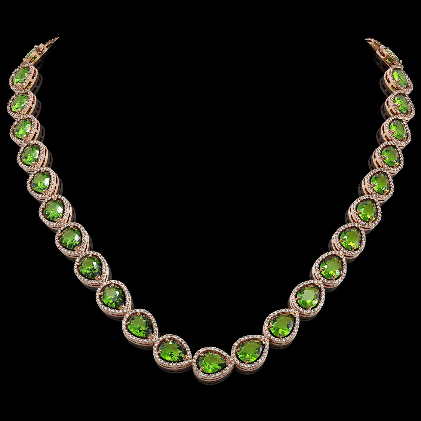 REF-675M3H -41214 ---- 33.6 CTW Peridot & Diamond Halo Necklace 10K Rose Gold ---- Luxury Designer Brand Necklace Appraised at $37,150 Certificate Number US41214 10k Rose gold, Necklace Size is 16 Inches, Necklace measuring approx. 10 mm x 16 Inches, weighing in total approx. 32 grams. Made in the USA and is stamped 10k, Main stone 27.2 carat total weight containing 32 pieces of Intense Green color with AAA quality Pear shape cut Peridot , Stone #2 6.4 carat total weight containing 800 pieces of G-H color with VS/SI quality Round shape cut Diamond