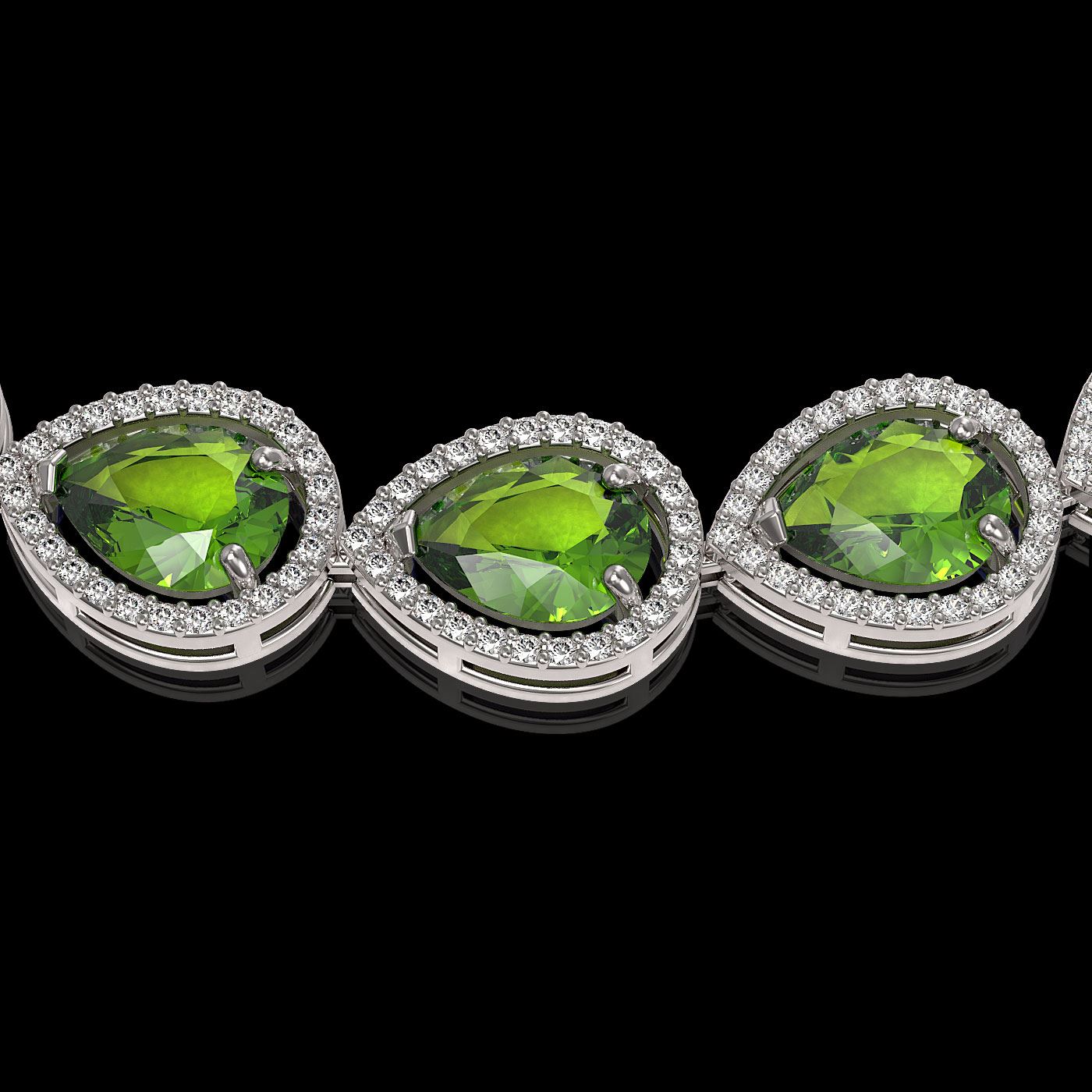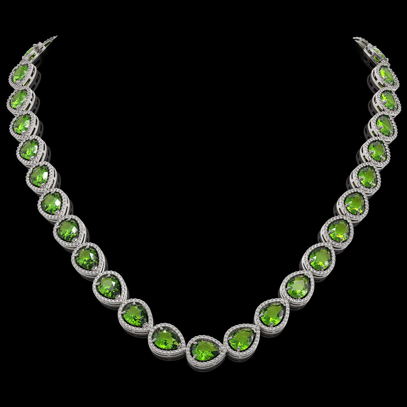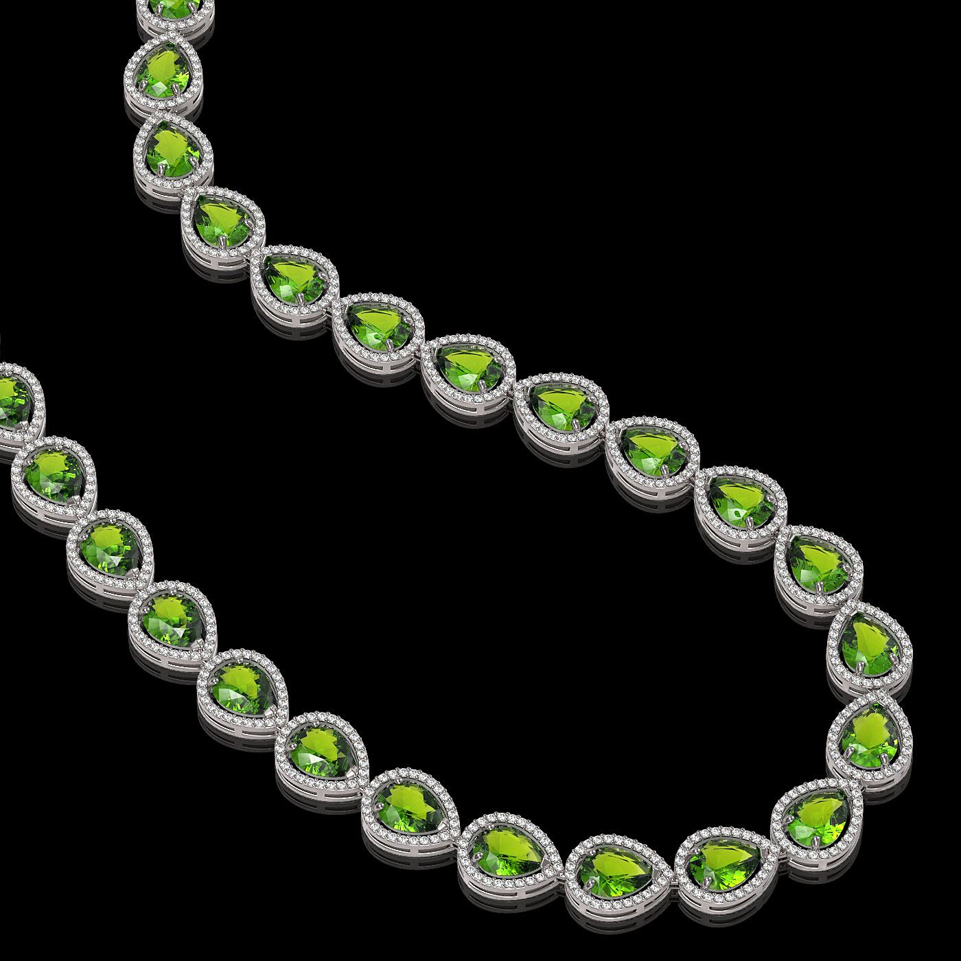 REF-675X3T -41213 ---- 33.6 CTW Peridot & Diamond Halo Necklace 10K White Gold ---- Luxury Designer Brand Necklace Appraised at $37,150 Certificate Number US41213 10k White gold, Necklace Size is 16 Inches, Necklace measuring approx. 10 mm x 16 Inches, weighing in total approx. 32 grams. Made in the USA and is stamped 10k, Main stone 27.2 carat total weight containing 32 pieces of Intense Green color with AAA quality Pear shape cut Peridot , Stone #2 6.4 carat total weight containing 800 pieces of G-H color with VS/SI quality Round shape cut Diamond