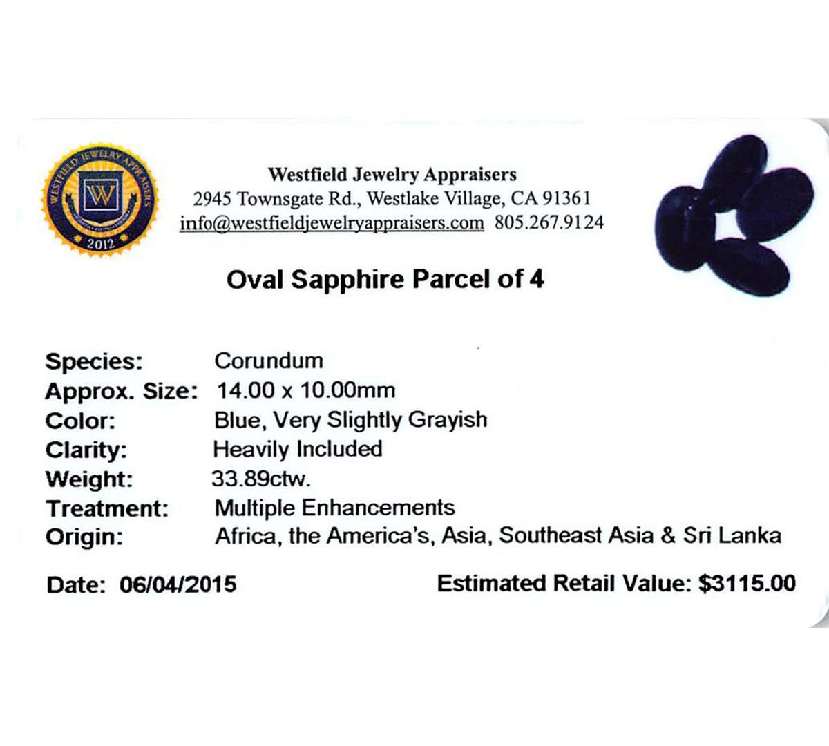 Four oval mixed cut natural blue sapphires, measuring 14.00 x 10.00 x 6.50mm, exact total weight 33.89ct., clarity is heavily included, type II, very dark, very slightly grayish, blue color, (GIA B 8/3), cut is good. Measurements are an average for the group. Transmitting light very diffusely, opaque, Naturally occurring internal & external characteristics are present, Indications of multiple laboratory enhancements, including high temperature heat treatment. Westfield Appraised at $3,115.00.