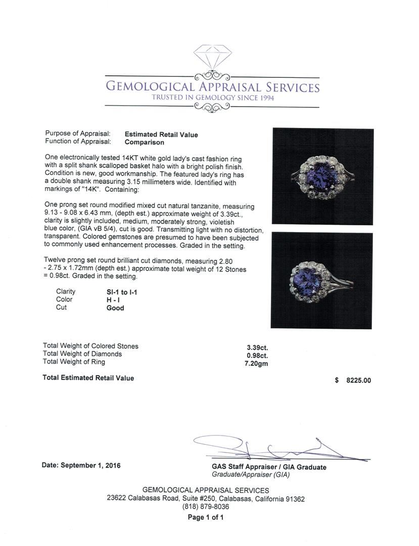 One electronically tested 14KT white gold lady's cast fashion ring with a split shank scalloped basket halo with a bright polish finish. The featured lady's ring has a double shank measuring 3.15 millimeters wide. Identified with markings of '14K'. Condition is new, good workmanship. Containing: One prong set round modified mixed cut natural tanzanite, measuring 9.13 - 9.08 x 6.43 mm, (depth est.) approximate weight of 3.39ct., clarity is slightly included, medium, moderately strong, violetish blue color, (GIA vB 5/4), cut is good. Transmitting light with no distortion, transparent. Colored gemstones are presumed to have been subjected to commonly used enhancement processes. Graded in the setting. Twelve prong set round brilliant cut diamonds, measuring 2.80 - 2.75 x 1.72mm (depth est.) approximate total weight of 12 Stones = 0.98ct. Graded in the setting. Clarity SI-1 to I-1. Color: H - I Cut Good. Total Weight of Colored Stones 3.39ct.. Total Weight of Diamonds 0.98ct.. Total Weight of Ring 7.20gm GAS Appraised at $8,225.00.