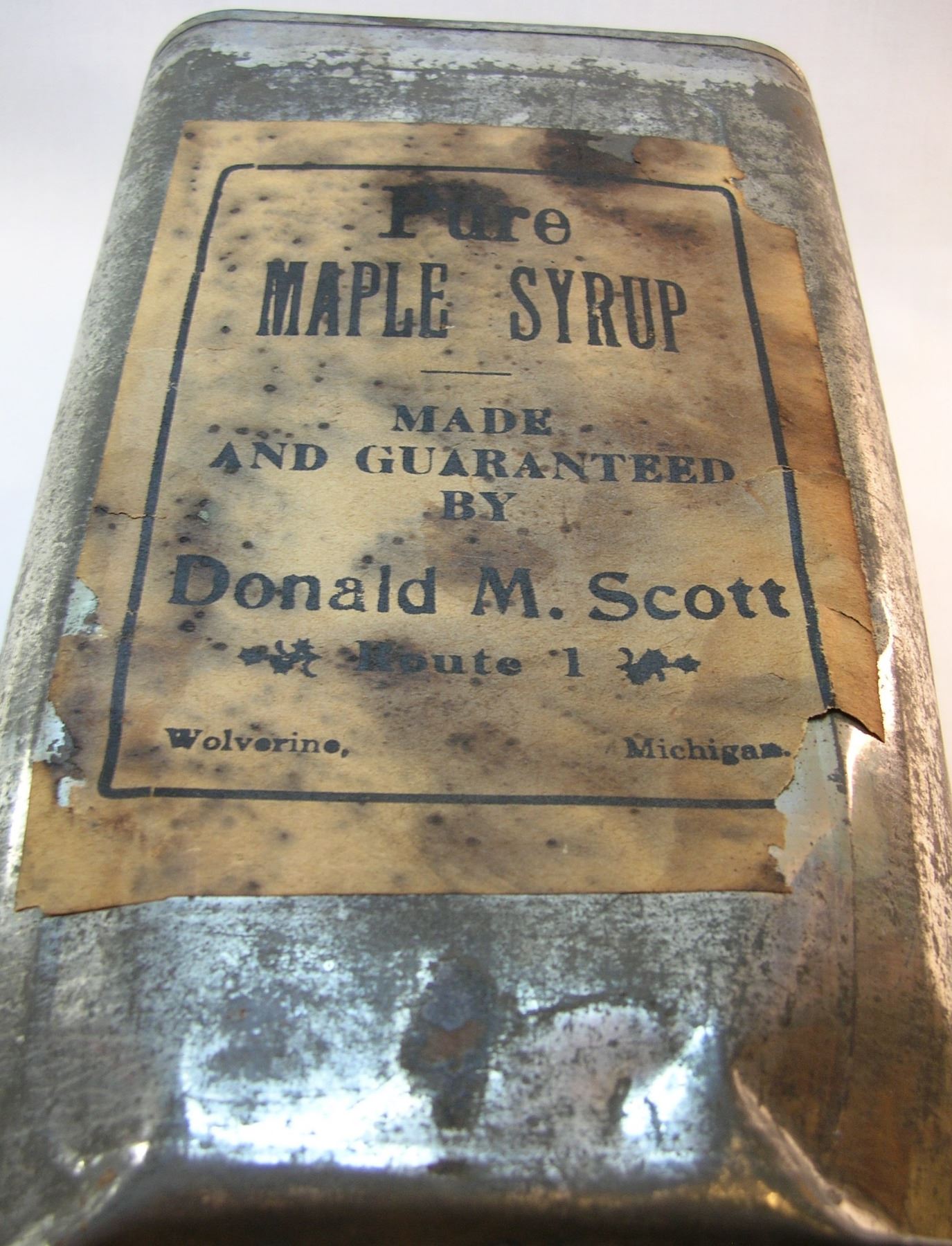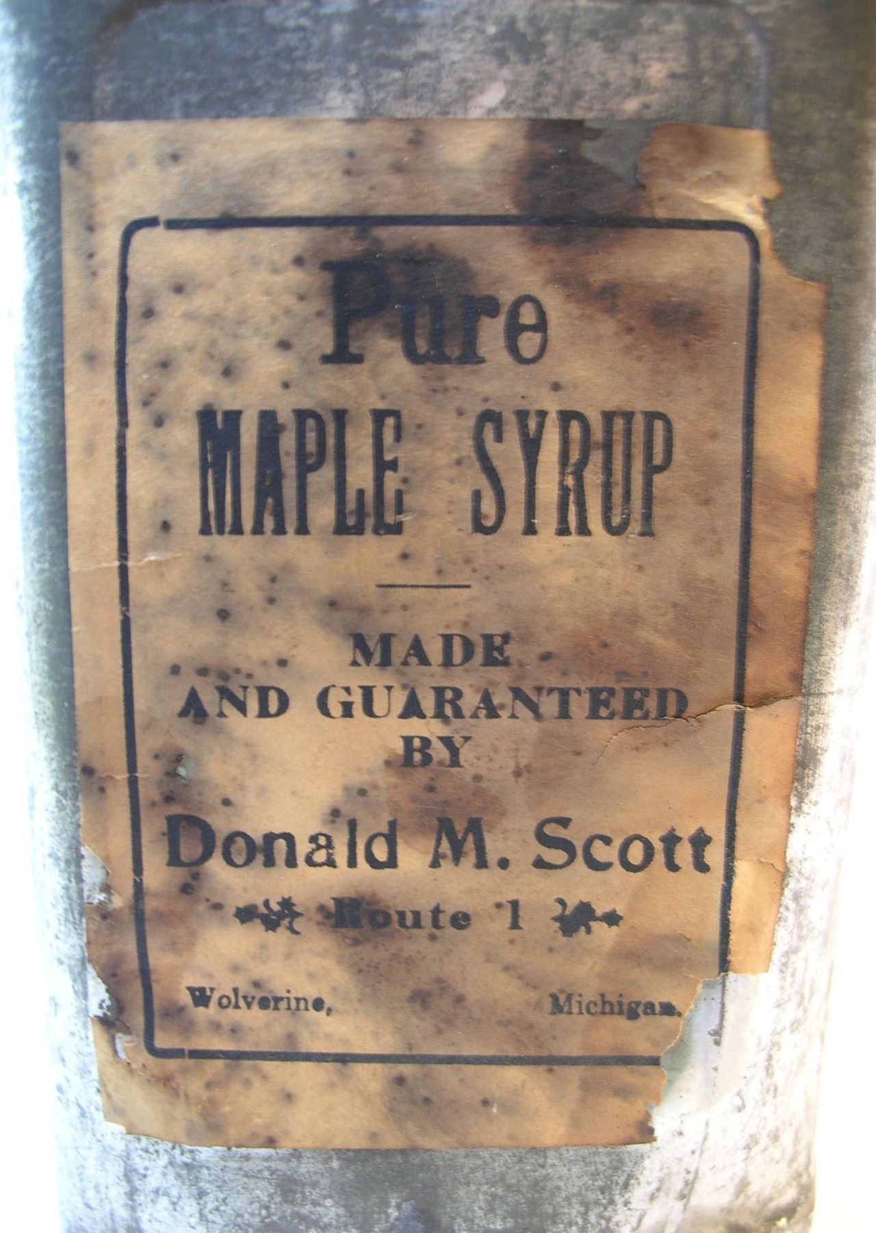 PURE / MAPLE SYRUP / MADE / AND GUARANTEED / BY / Donald M. Scott / Route 1 / Wolverine, Michigan