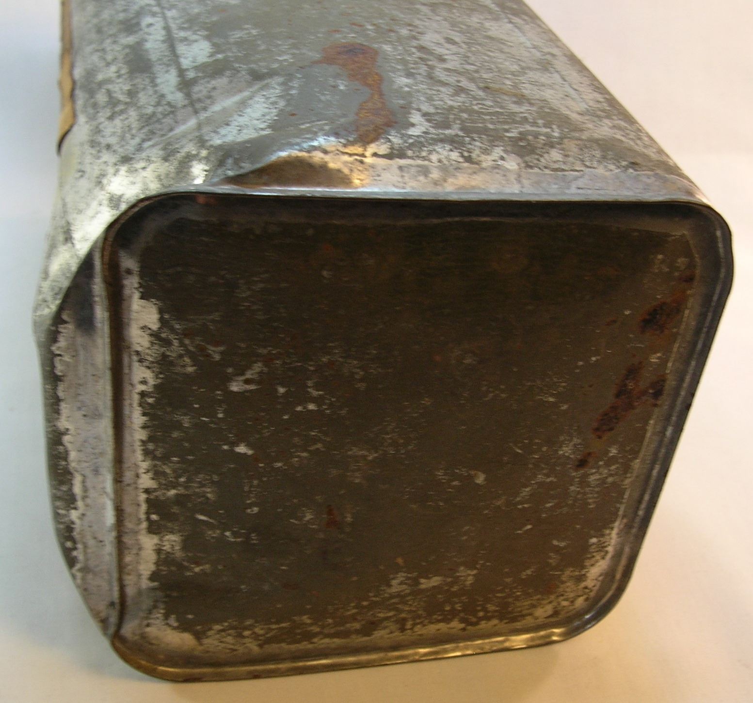 Overall condition shows quite a bit of stains on the label and some minor missing portions, plus the tin, although showing barely any rust, has some dings and wear, one major crunch on the front right bottom corner. See pics.