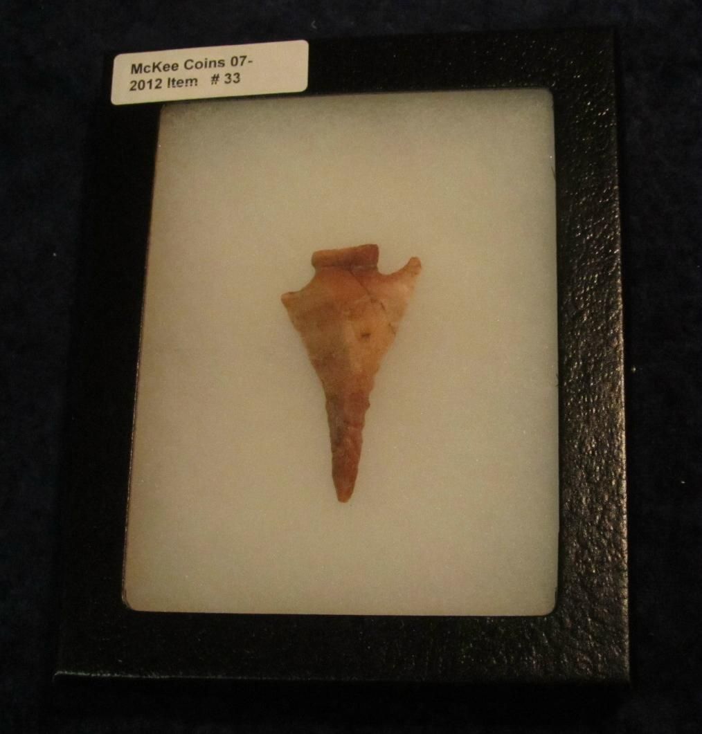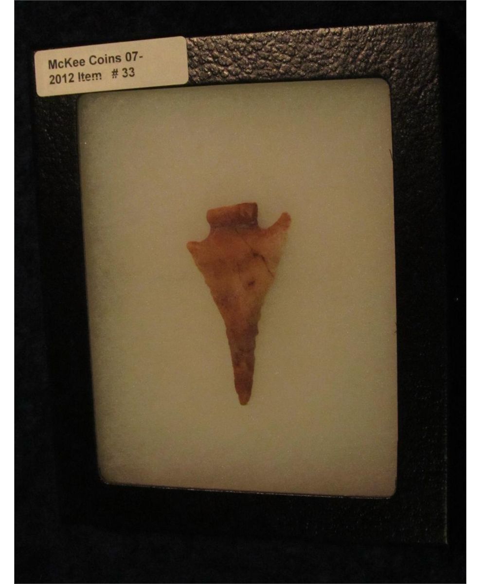33. Flint Knappers Special. 2 1/4" Stemmed Drill in extremely multi-colored Flint. Displayed in a glass faced show case.