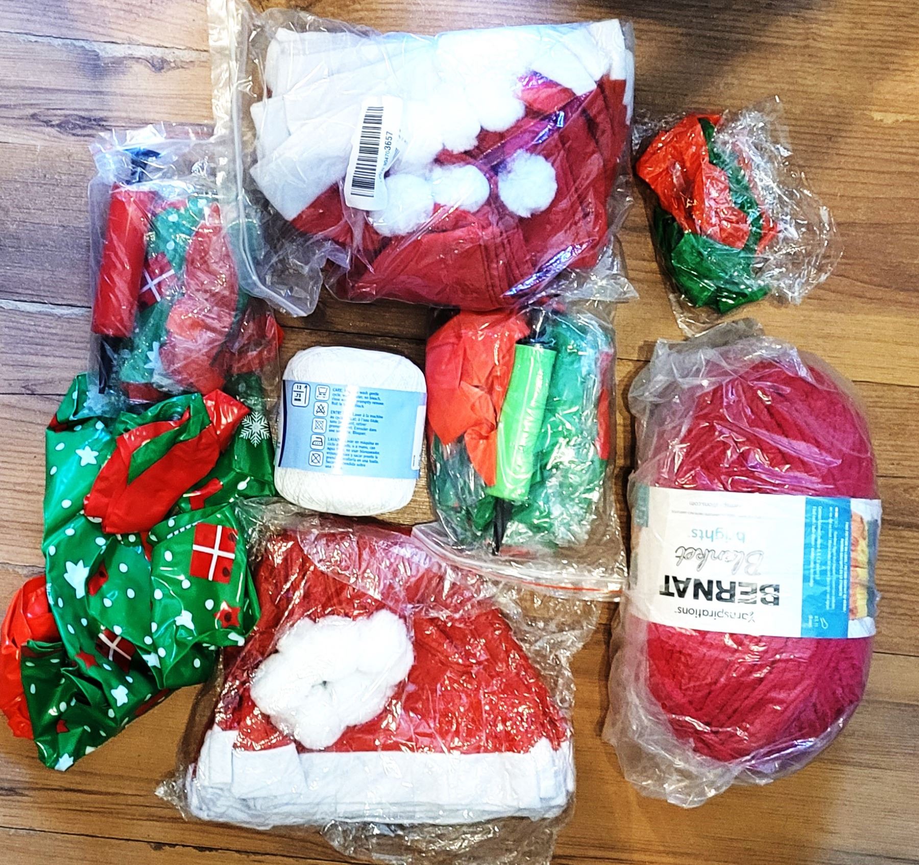 SHAPES AND PUMP, SANTA HATS AND YARN. SEASONAL