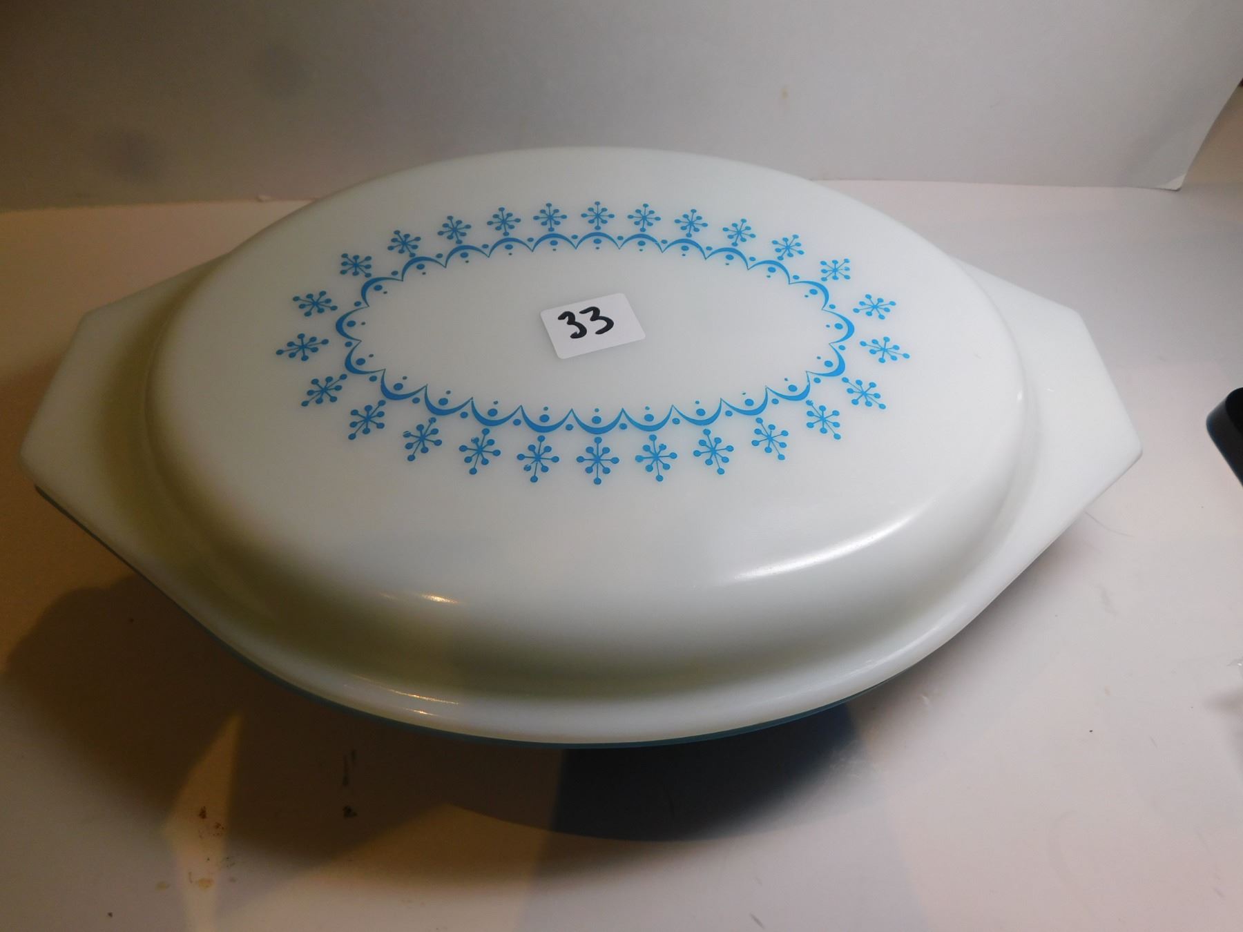 33. PYREX SNOWFLAKE DIVIDED 1 QT CASSSEROLE DISH, BLUE BASE, WITH LID