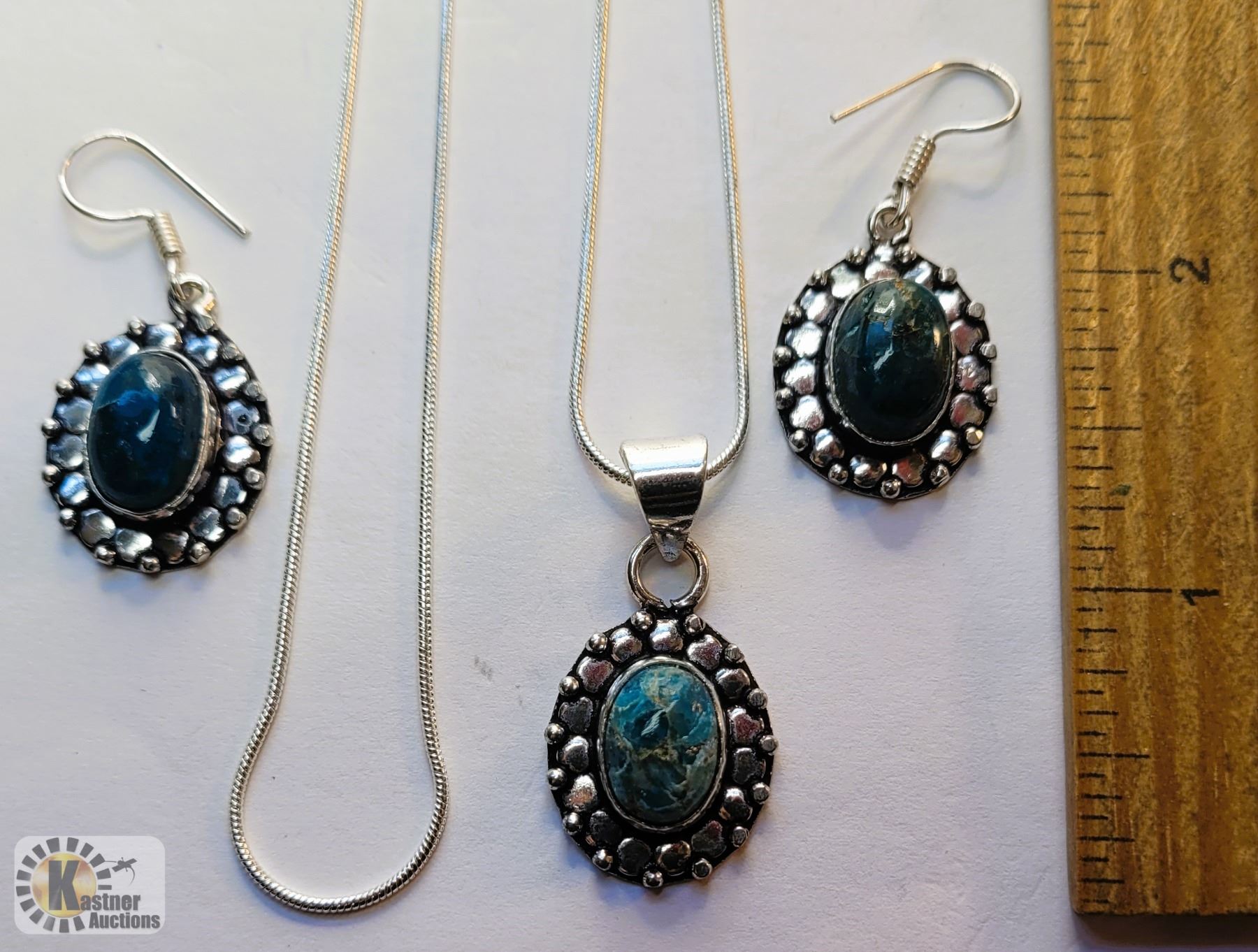 DROP EARRINGS & MATCHING PENDANT ON 20" SNAKE CHAIN, ALL PIECES ARE STAMPED 925 SILVER PLATE. JEWELLERY