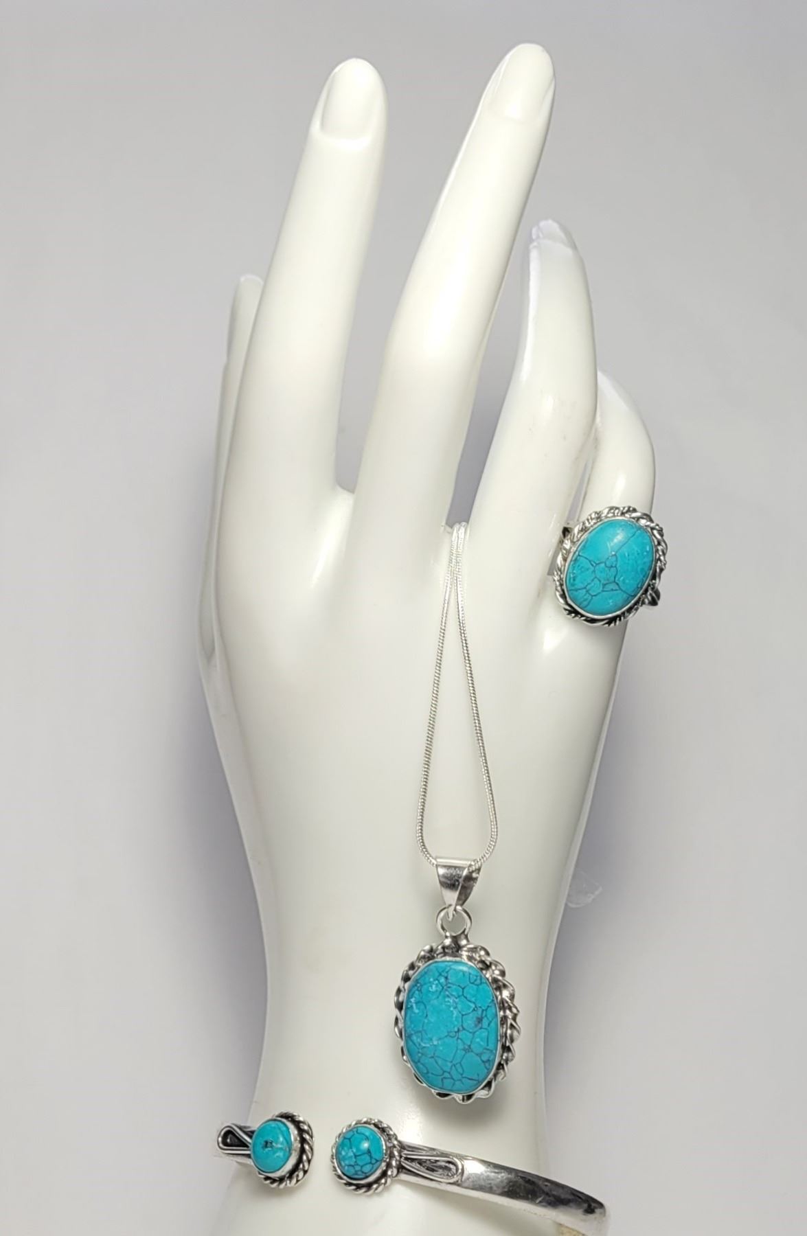 INCLUDES SIZE 7.5 RING, BANGLE STYLE BRACELET WITH STONES ON EACH END AND OVAL PENDANT ON 18" SNAKE CHAIN. JEWELERY