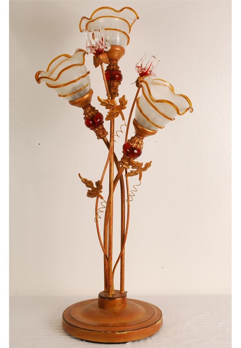 Brushed and painted metal and blown glass table lamp. Lamp is painted golf with three stems. Glass flowers make lamps. Accented with blown glass flowers in red and white and gold painted metal leaves. Round circular base. 11"Diameter.
