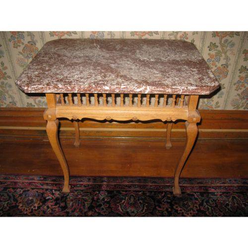 33" wide x 23" marble top oak table w/spindles, 28" tall