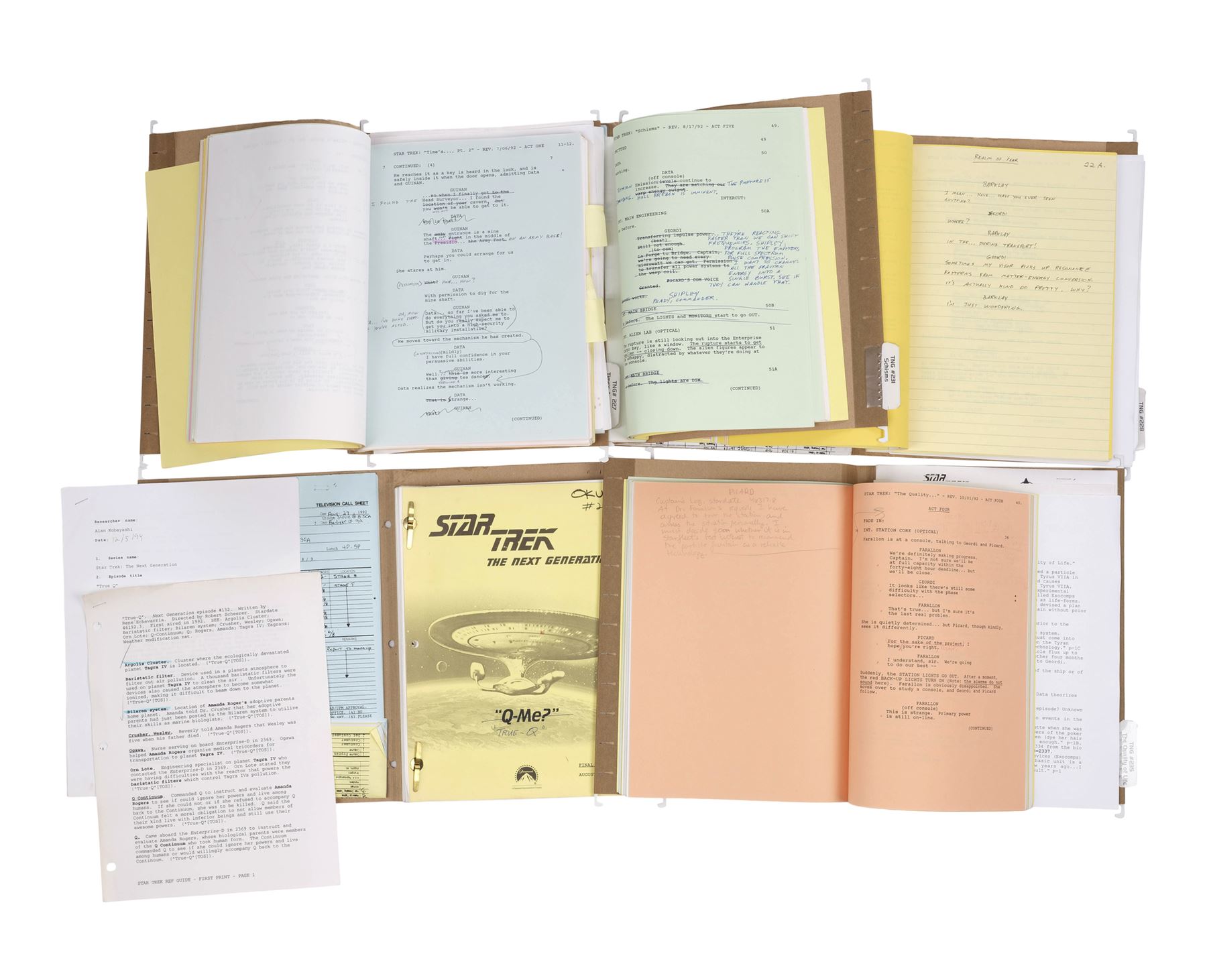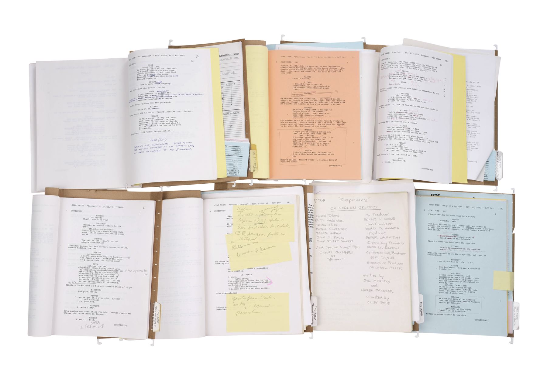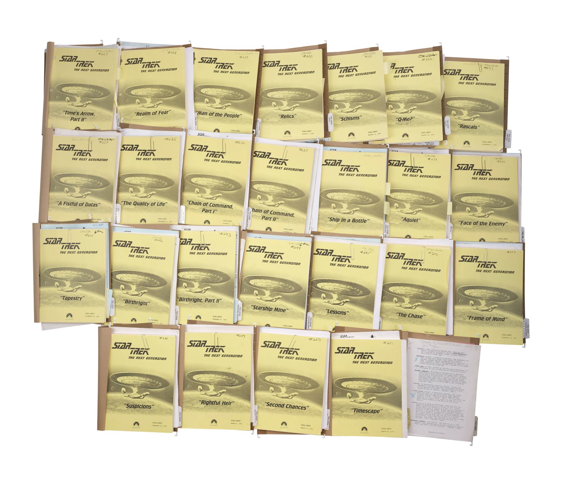 This lot comes from the collection of celebrated Star Trek franchise artists and advisors Michael and Denise Okuda. It consists of 26 scripts, one for each episode of the season, each in labeled hanging folders with hand-annotated color-coded revision pages as well as call sheets and other production ephemera. The paper exhibits minor wear from use and age, including edge wear. Dimensions: (grouped) 13" x 11" x 16" (33.25 cm x 28 cm x 40.75 cm)Though their long and celebrated careers in the Star Trek world began in features, Michael and Denise Okuda established themselves as franchise legends while working on Star Trek: The Next Generation. Michael became art supervisor on TNG, while Denise came on as a scenic artist during Deep Space Nine, roles they would continue to perform through Voyager, Enterprise, and the Next Generation films. Married in 1993, the Okudas are known as the driving forces behind the development of many of the now-iconic 24th-century technologies seen throughout the series, including the famous "Okudagrams" they created for the LCARS (Library Computer Access and Retrieval System) interfaces . Propstore is proud to present a selection of key memorabilia from the personal collection of one of the franchise's most important creative teams to the public for the first time.