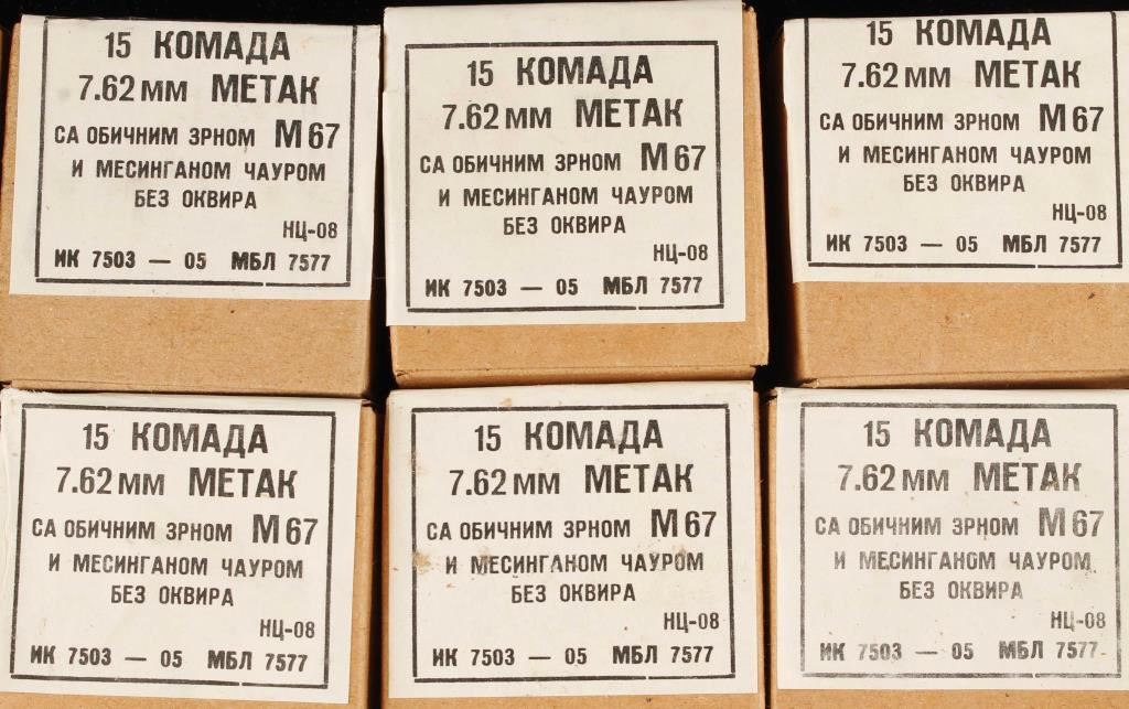 Yugoslavian military surplus ammo in 15 round boxes, brass cased with 123 grain FMJ lead core bullets. In green metal ammo canister.