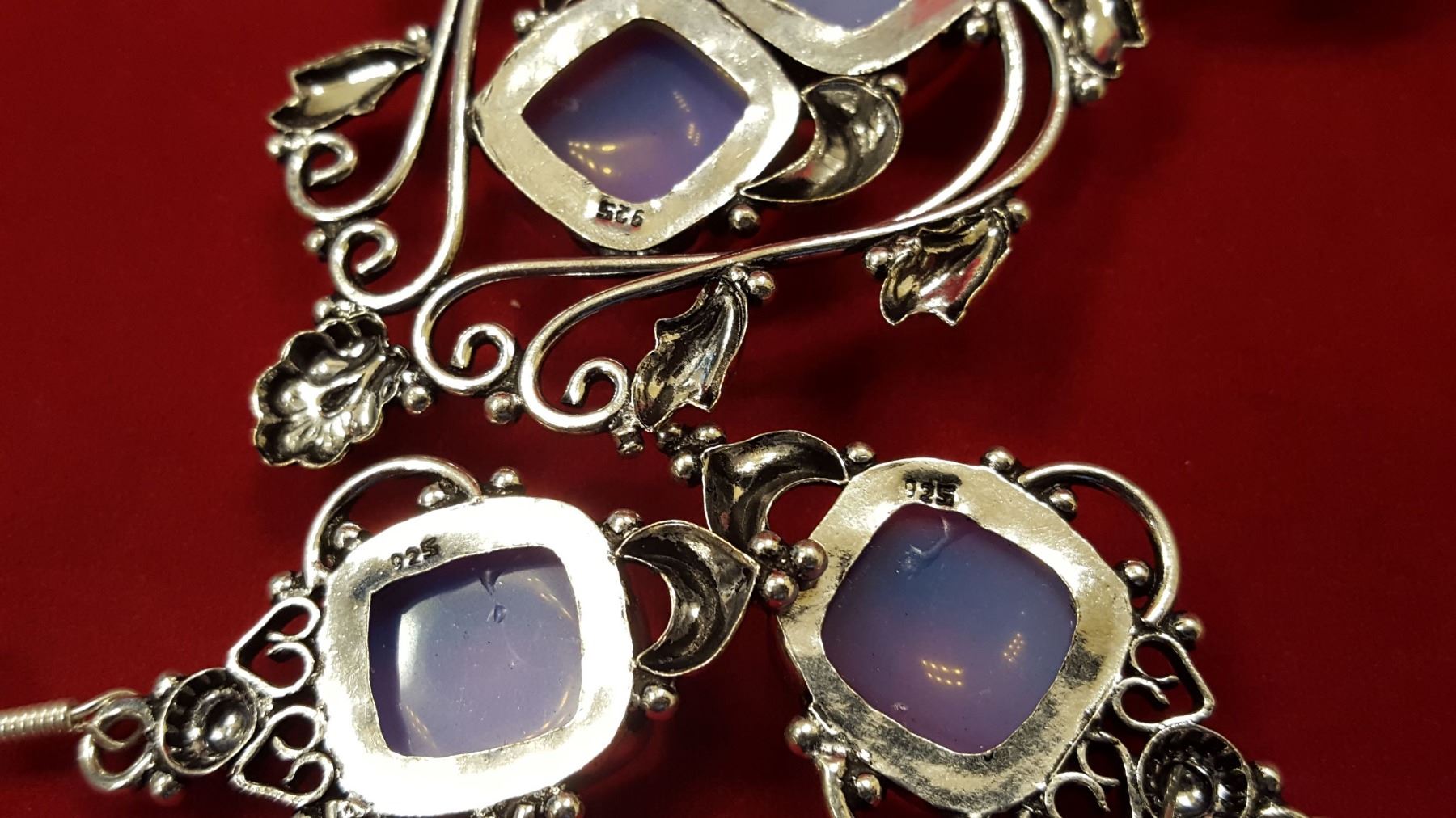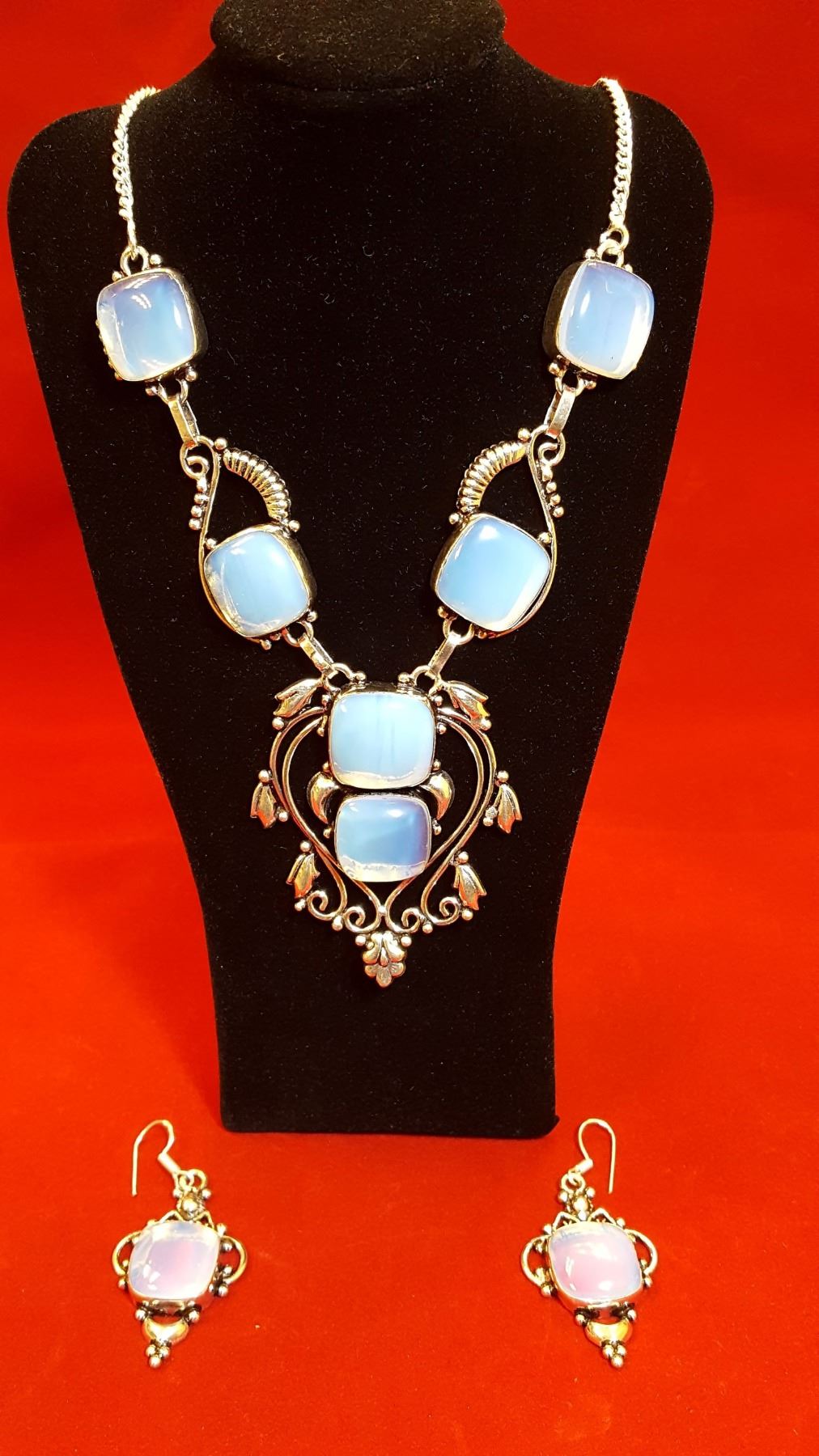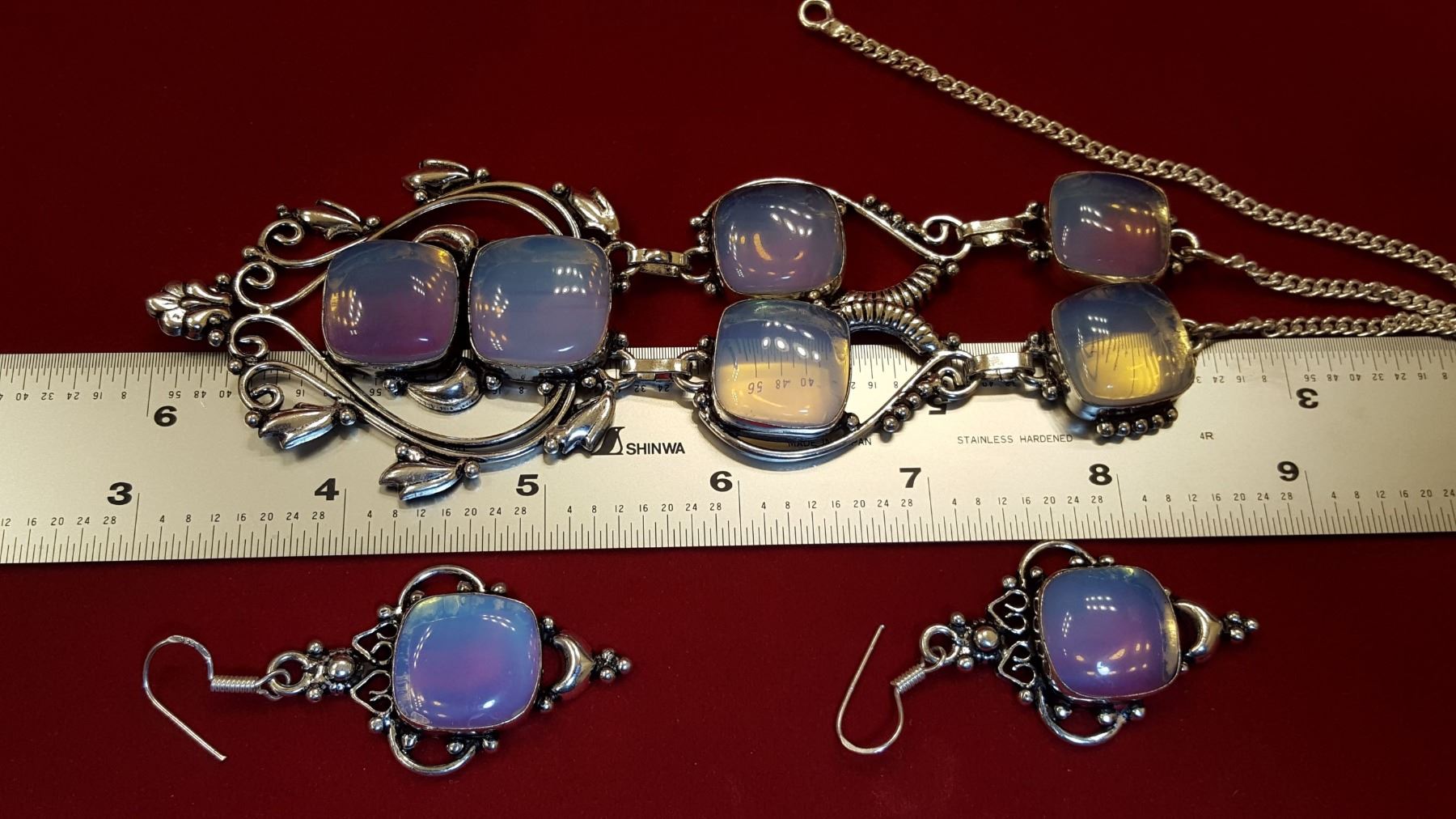 Stunning luimicent 330ctw opalite necklace and earring set. Mounted in .925 sterling silver. 18" long. This necklace set just bursts out with a full spectrum of color play. Absolutely beautiful.